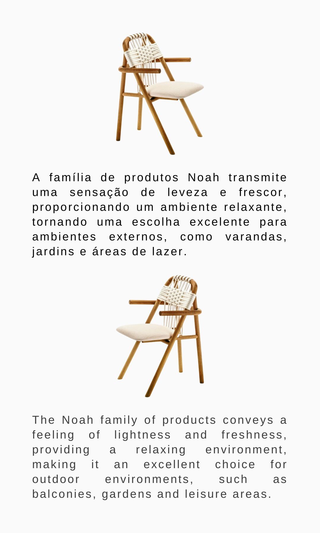 A família de produtos Noah transmite uma sensação de leveza e frescor, proporcionando um ambiente relaxante, tornando uma escolha excelente para ambientes externos, como varandas, jardins e áreas de lazer. The Noah family of products conveys a feeling of lightness and freshness, providing a relaxing environment, making it an excellent choice for outdoor environments, such as balconies, gardens and leisure areas.