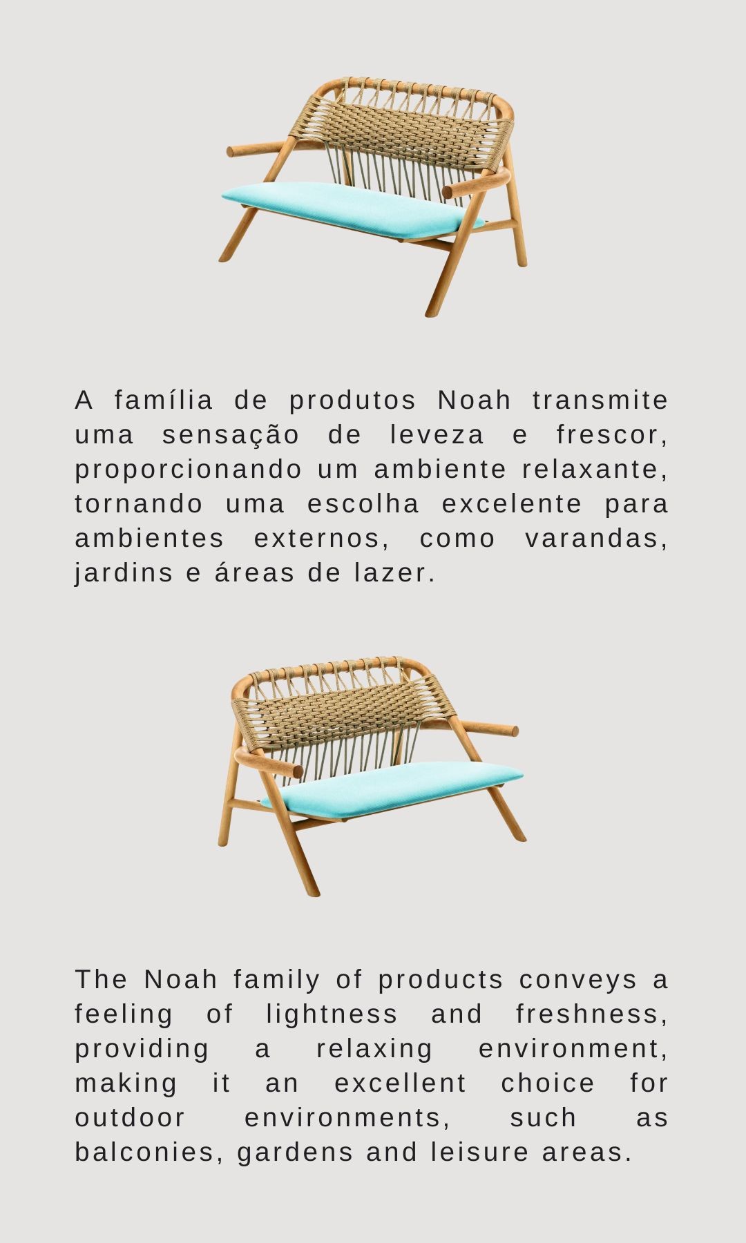 A família de produtos Noah transmite uma sensação de leveza e frescor, proporcionando um ambiente relaxante, tornando uma escolha excelente para ambientes externos, como varandas, jardins e áreas de lazer.