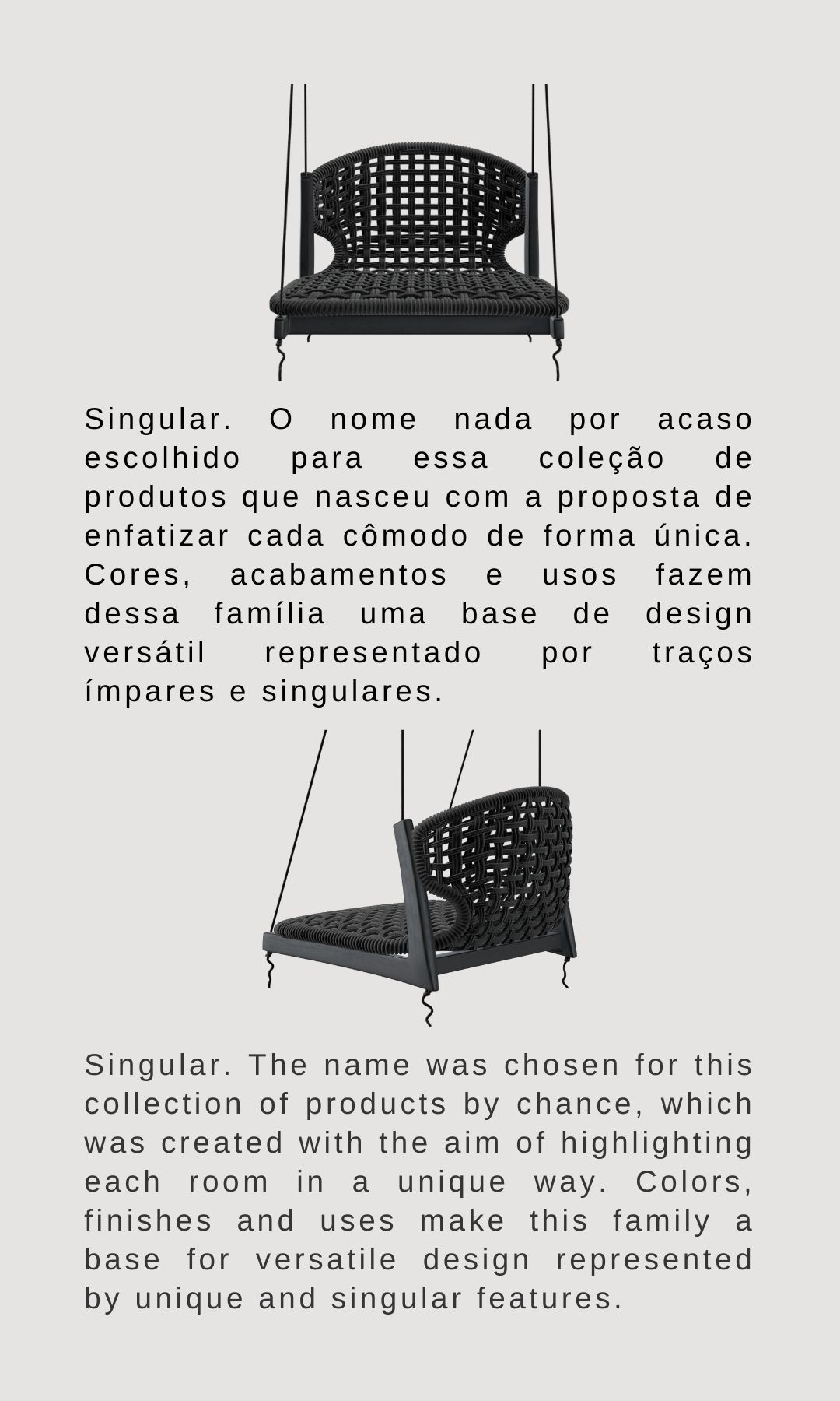 Singular. O nome nada por acaso escolhido para essa coleção de produtos que nasceu com a proposta de enfatizar cada cômodo de forma única. Cores, acabamentos e usos fazem dessa família uma base de design versátil representado por traços ímpares e singulares. Singular. The name was chosen for this collection of products by chance, which was created with the aim of highlighting each room in a unique way. Colors, finishes and uses make this family a base for versatile design represented by unique and singular features.