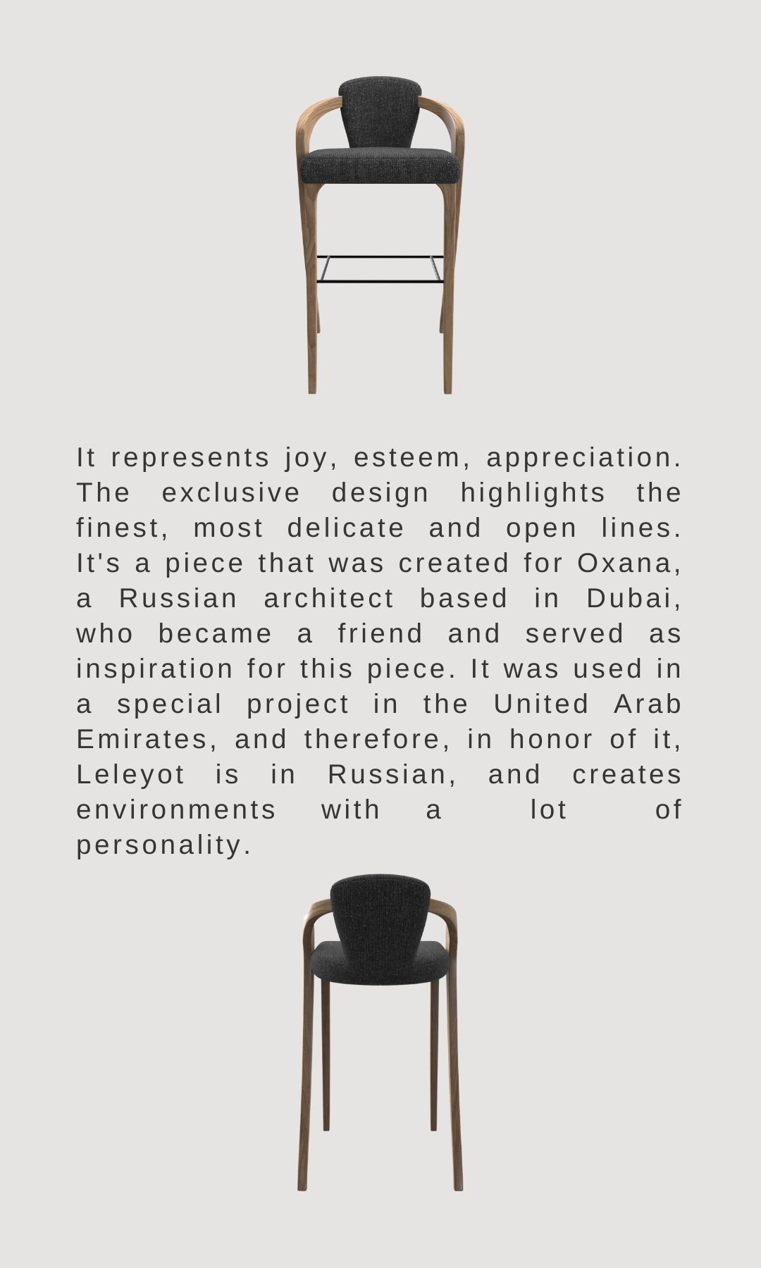 It represents joy, esteem, appreciation. The exclusive design highlights the finest, most delicate and open lines. It's a piece that was created for Oxana, a Russian architect based in Dubai, who became a friend and served as inspiration for this piece. It was used in a special project in the United Arab Emirates, and therefore, in honor of it, Leleyot is in Russian, and creates environments with a lot of personality.