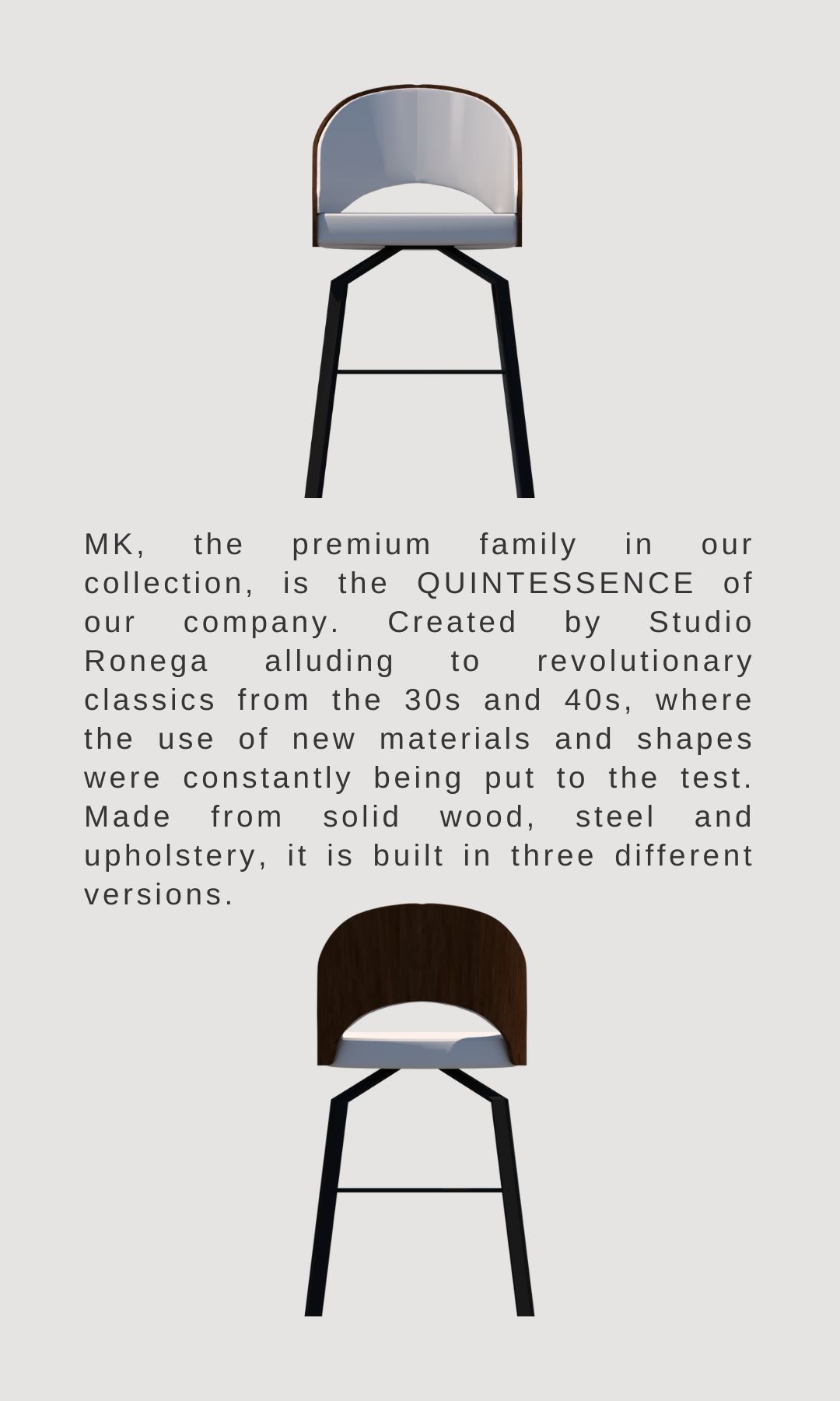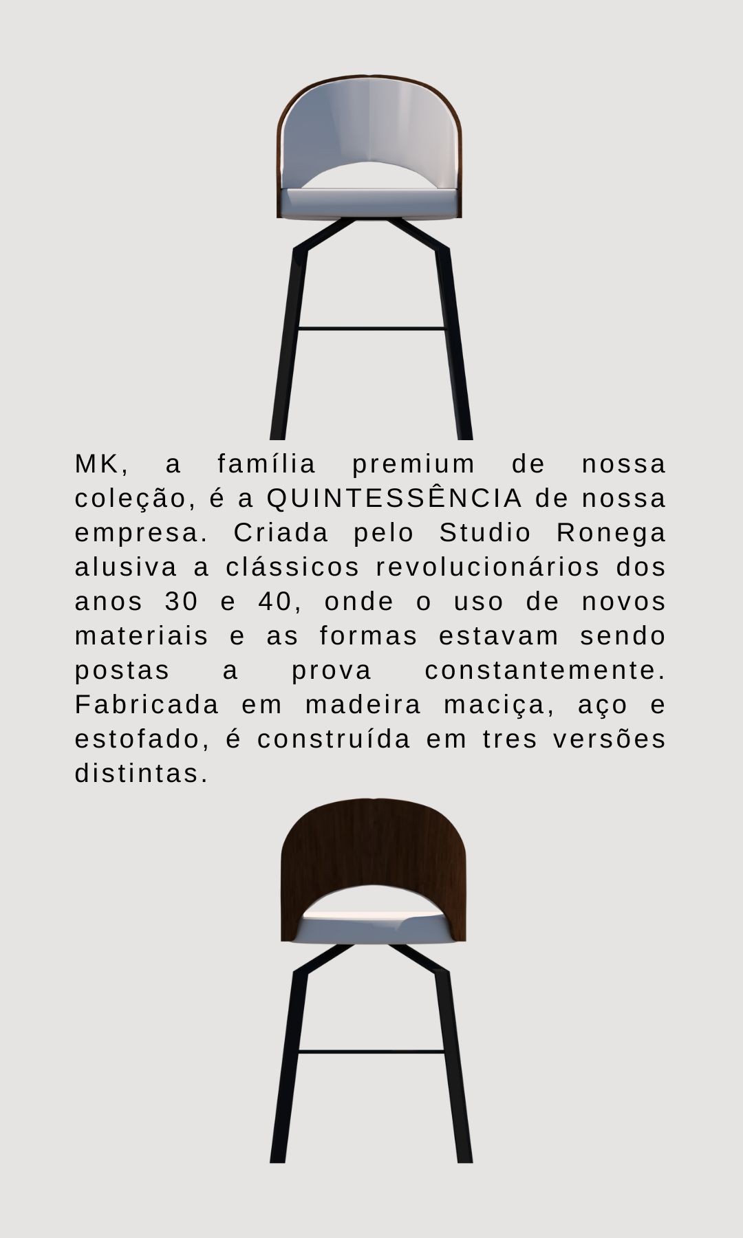 MK, a família premium de nossa coleção, é a QUINTESSÊNCIA de nossa empresa. Criada pelo Studio Ronega alusiva a clássicos revolucionários dos anos 30 e 40, onde o uso de novos materiais e as formas estavam sendo postas a prova constantemente. Fabricada em madeira maciça, aço e estofado, é construída em tres versões distintas.