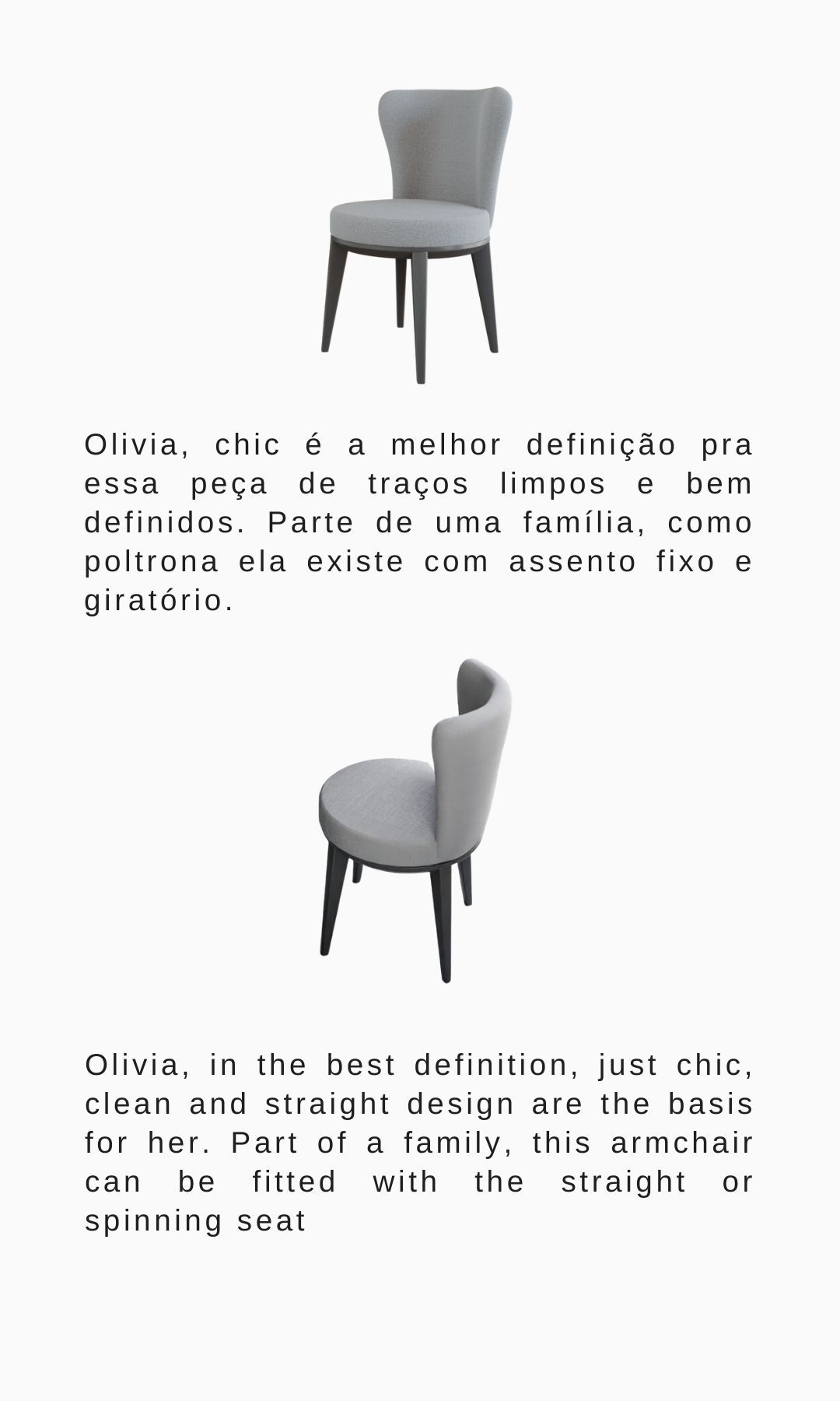 Olivia, chic é a melhor definição pra essa peça de traços limpos e bem definidos. Parte de uma família, como banqueta ela existe com assento fixo e giratório.