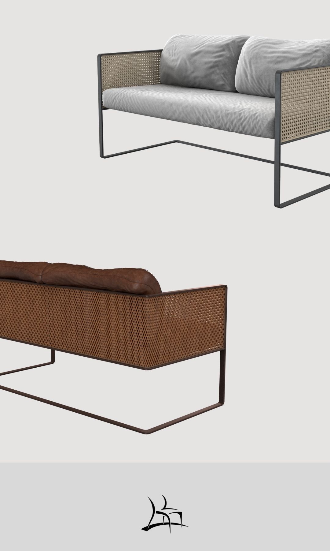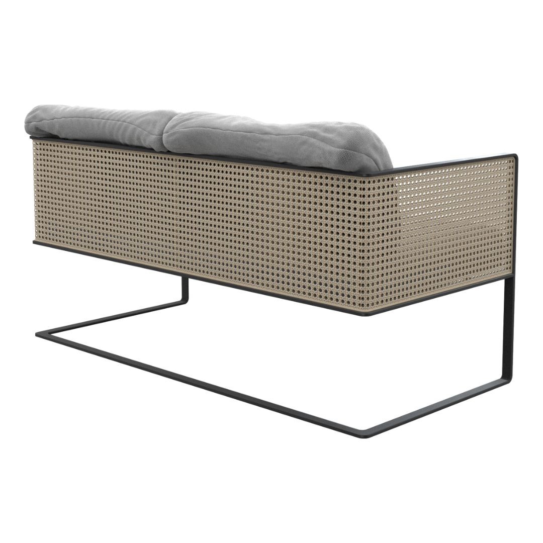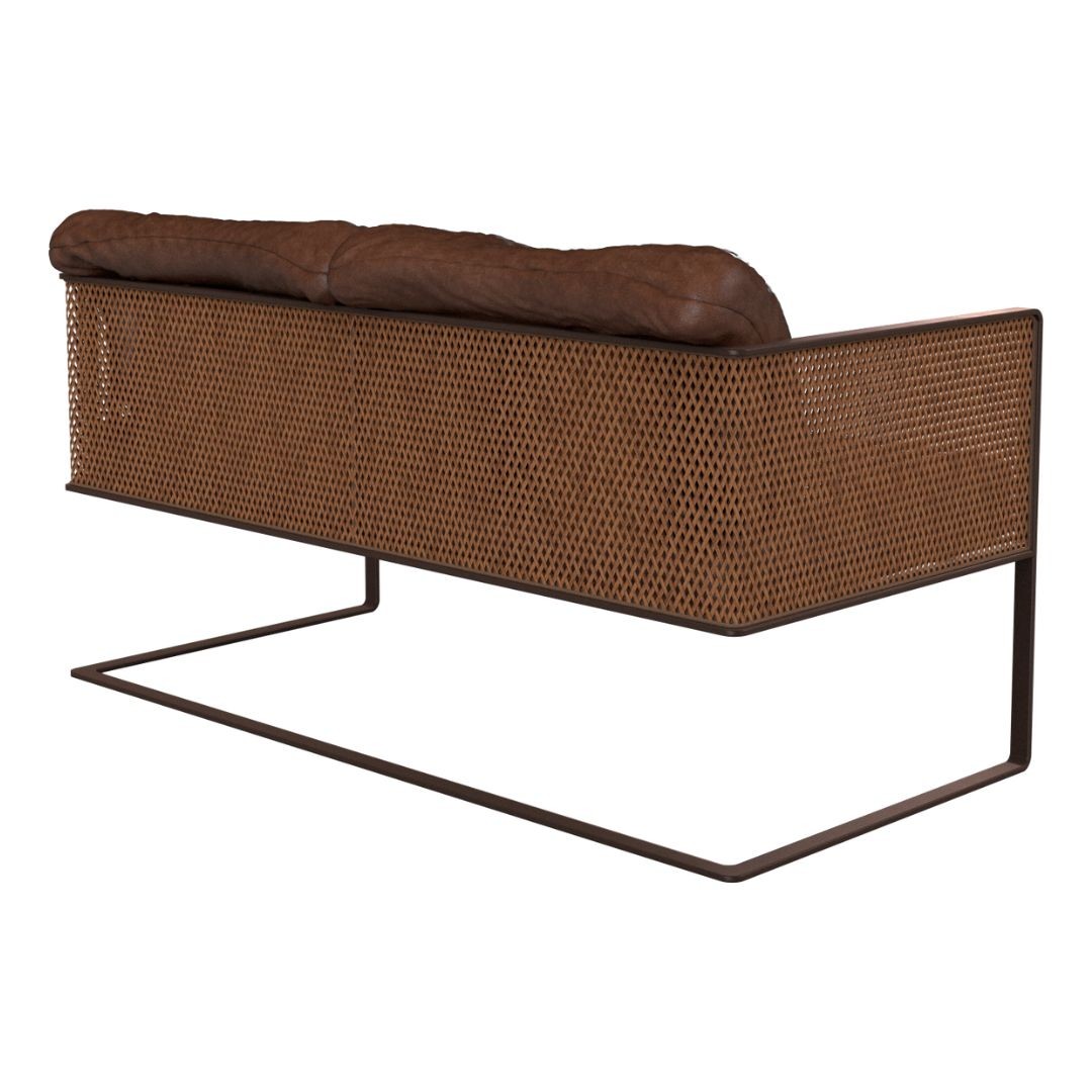 Simetria e movimento. Uma poltrona versátil, moderna e arrojada com uma estrutura que combina madeira maciça, metal, palha, tecidos e couros. Aja é possibilidade.
