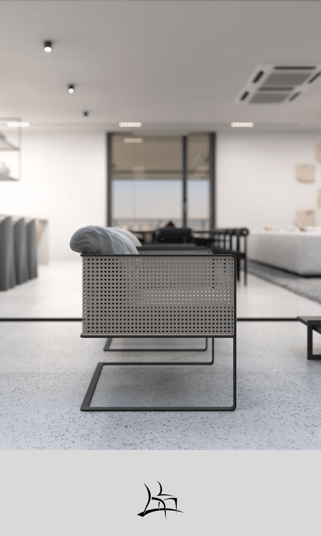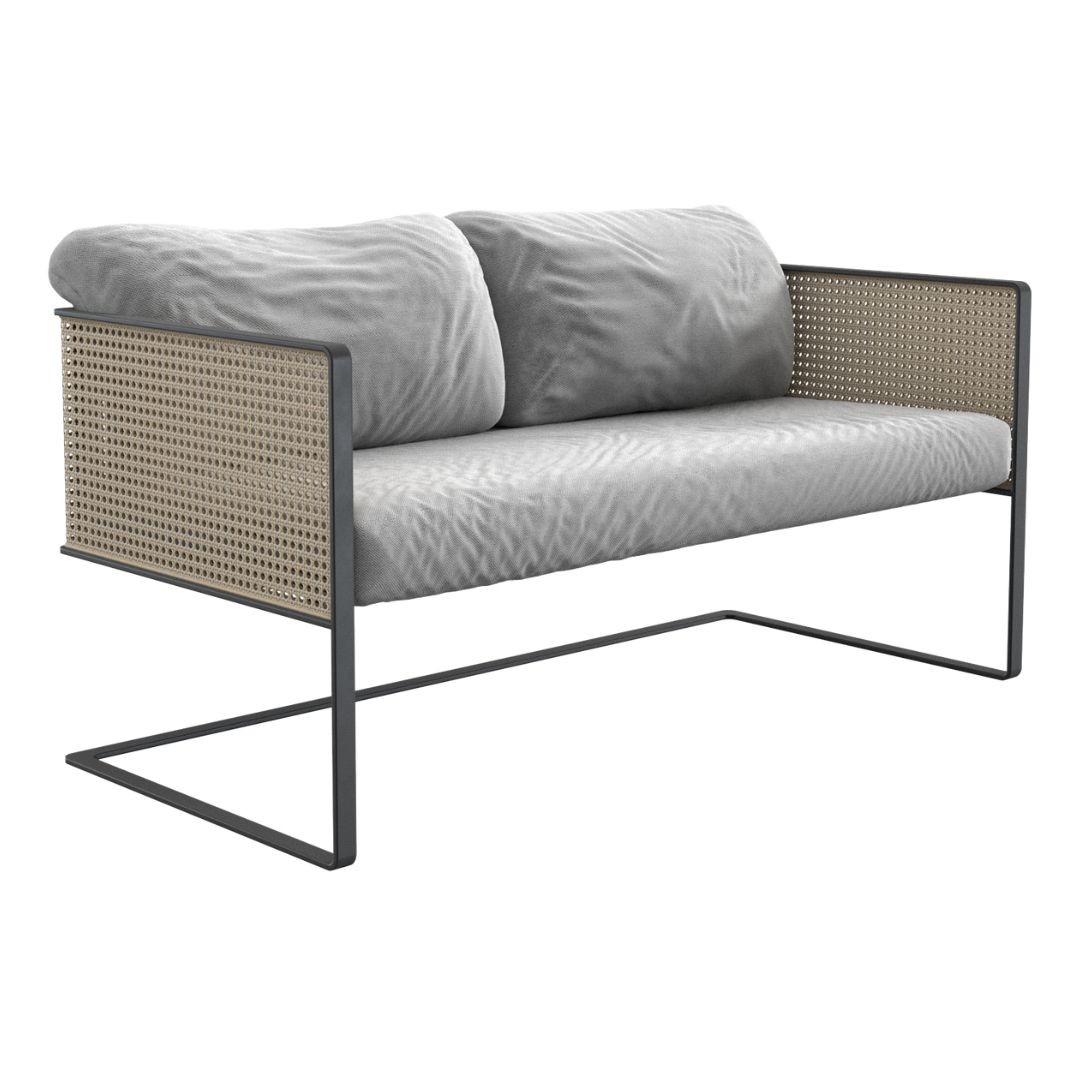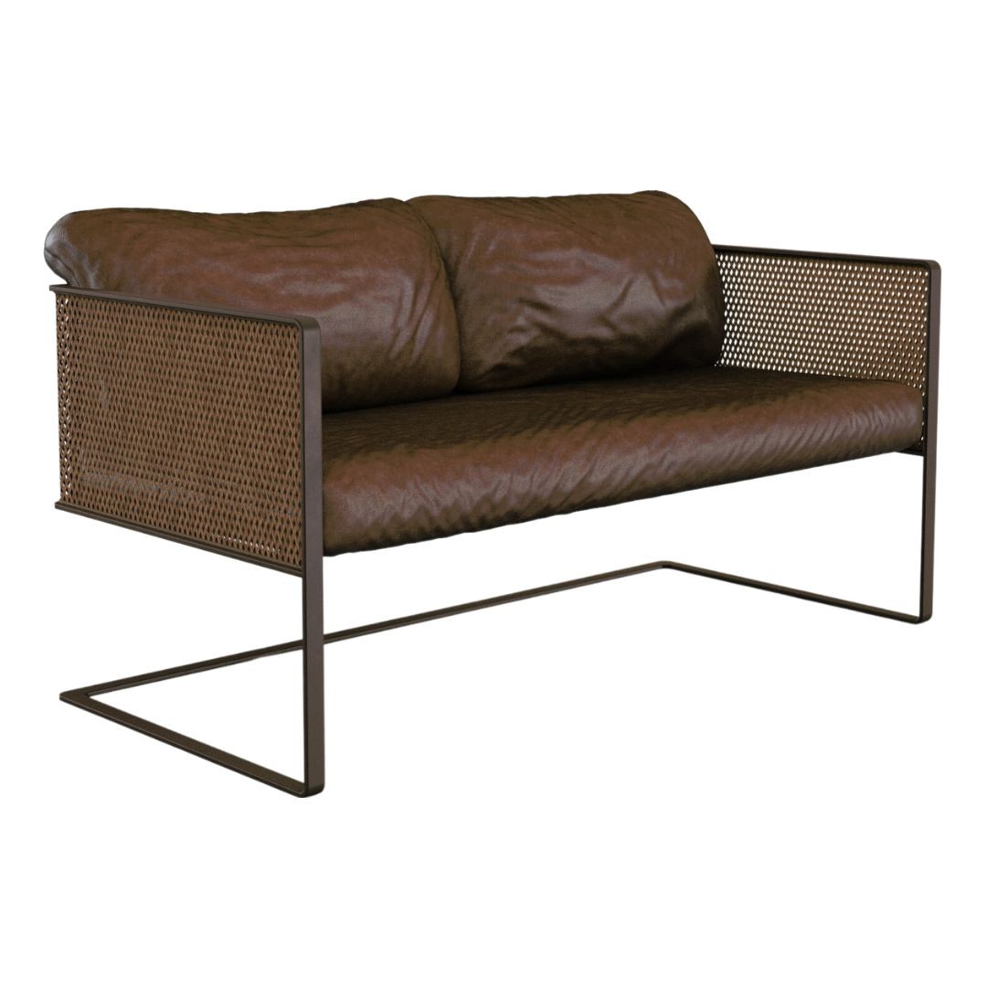Simetria e movimento. Uma poltrona versátil, moderna e arrojada com uma estrutura que combina madeira maciça, metal, palha, tecidos e couros. Aja é possibilidade.