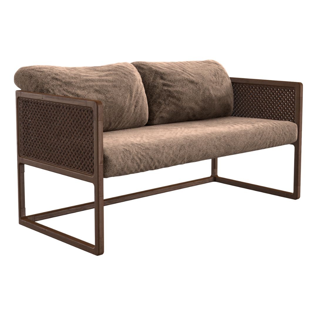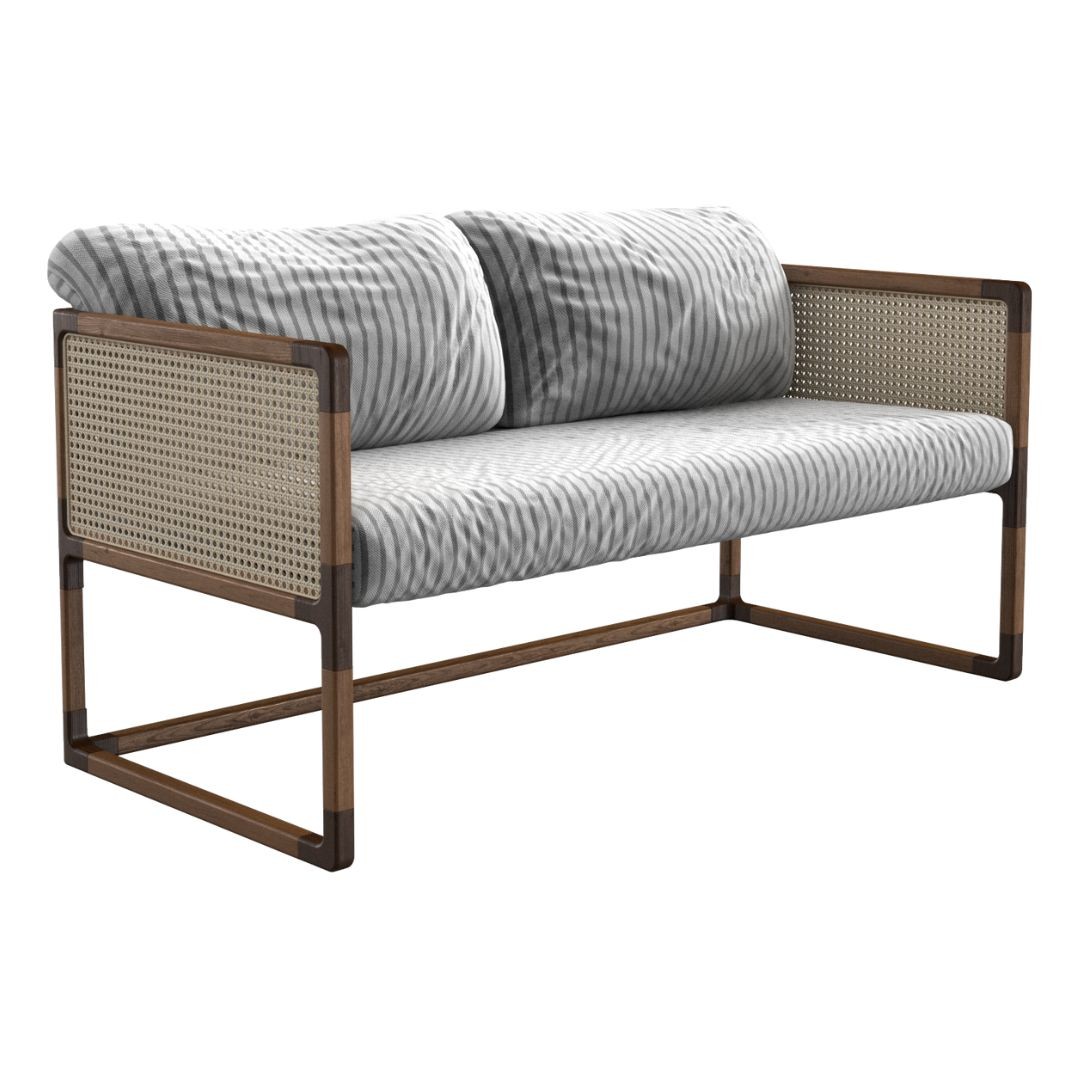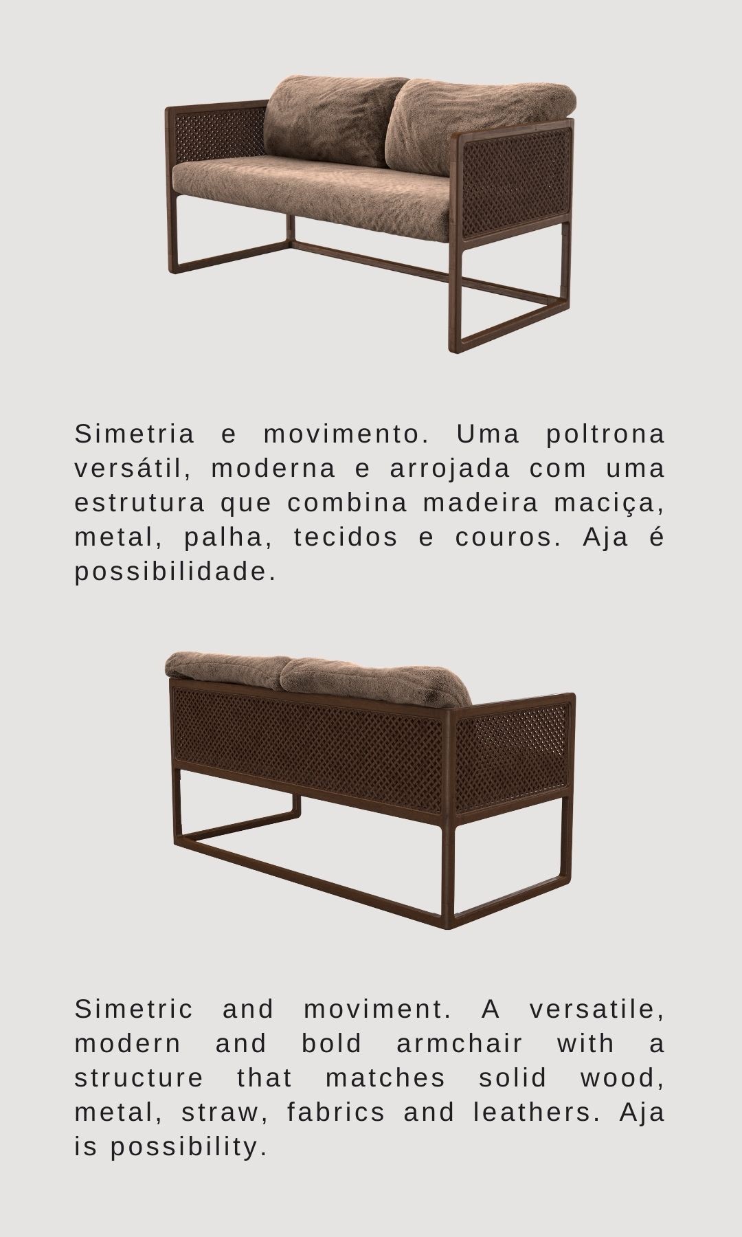 Simetria e movimento. Uma poltrona versátil, moderna e arrojada com uma estrutura que combina madeira maciça, metal, palha, tecidos e couros. Aja é possibilidade.