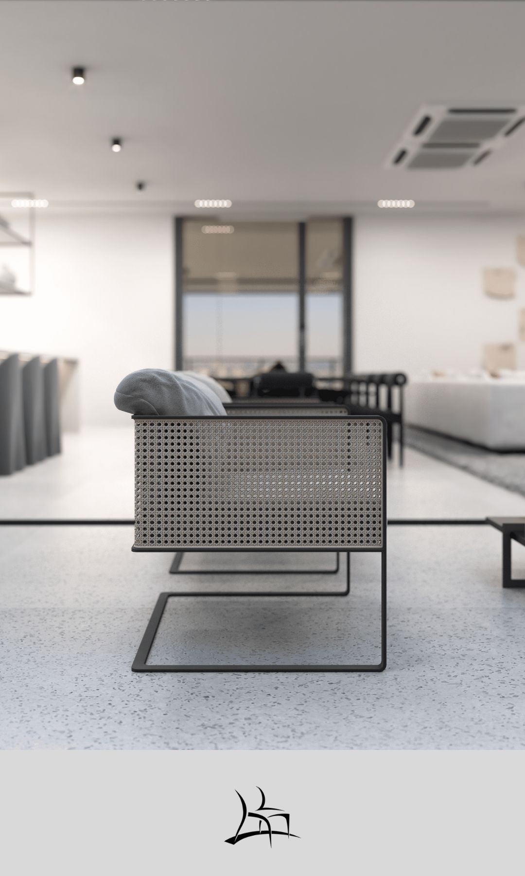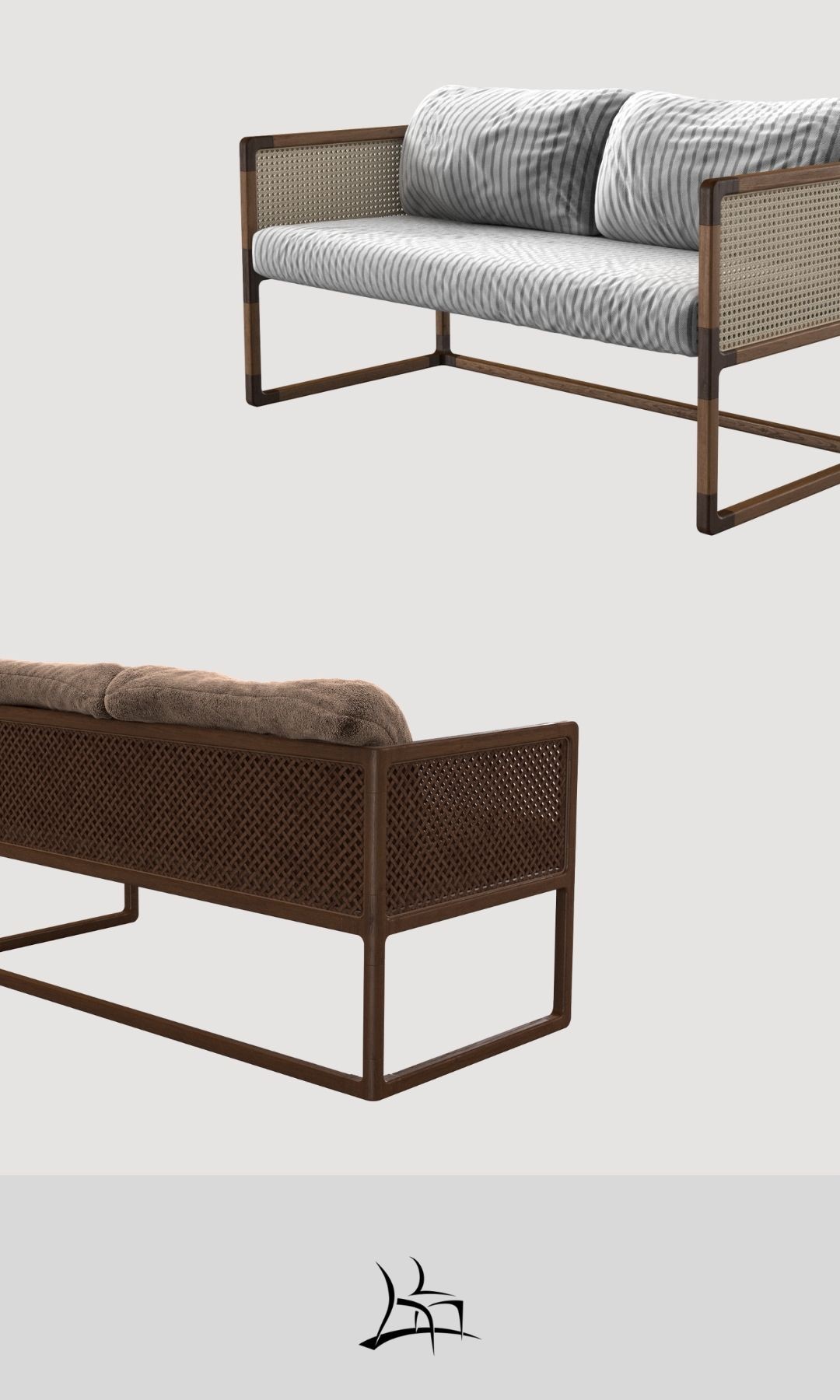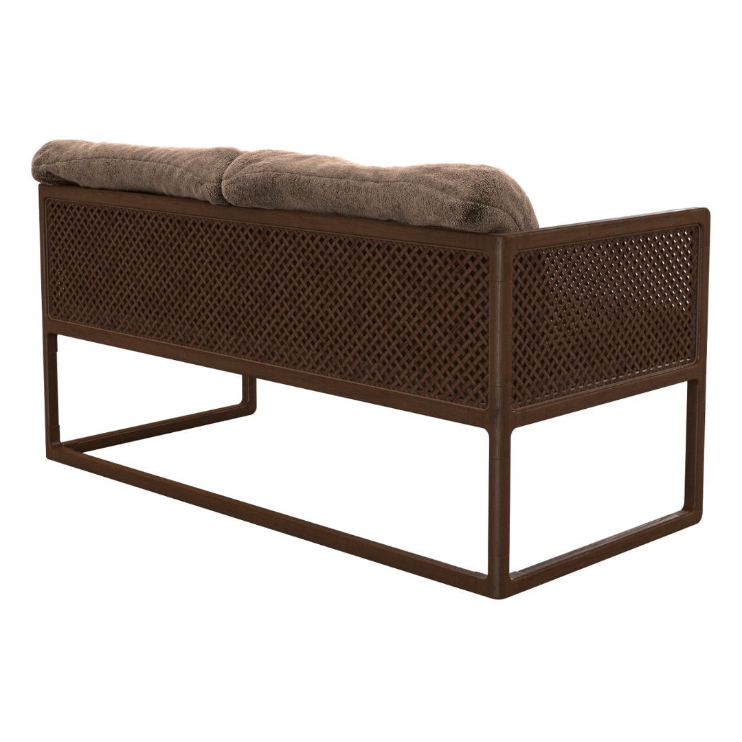 Simetria e movimento. Uma poltrona versátil, moderna e arrojada com uma estrutura que combina madeira maciça, metal, palha, tecidos e couros. Aja é possibilidade.