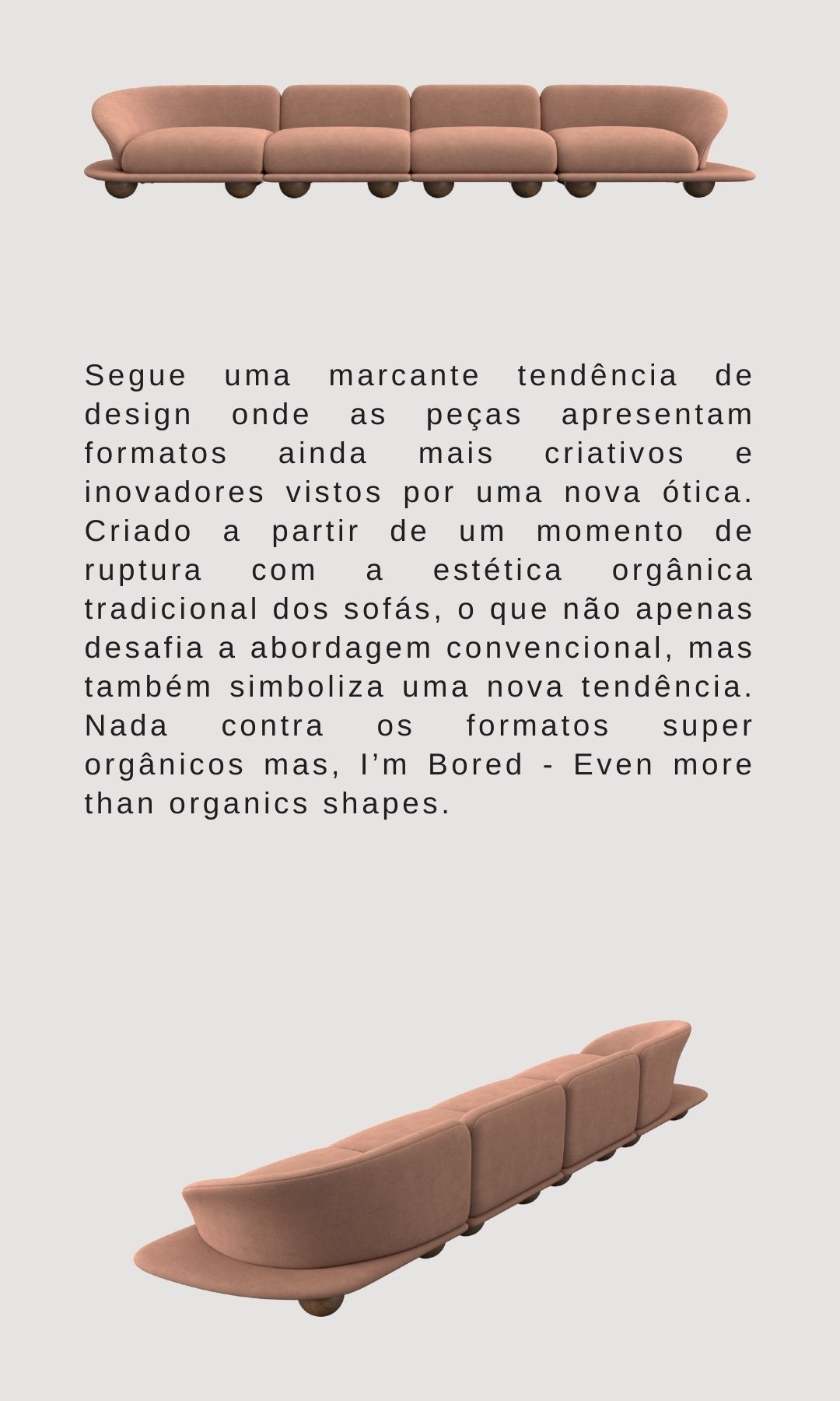 Segue uma marcante tendência de design onde as peças apresentam formatos ainda mais criativos e inovadores vistos por uma nova ótica. Criado a partir de um momento de ruptura com a estética orgânica tradicional dos sofás, o que não apenas desafia a abordagem convencional, mas também simboliza uma nova tendência. Nada contra os formatos super orgânicos mas, I’m Bored - Even more than organics shapes.