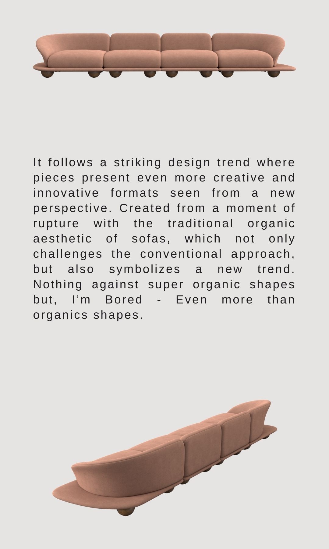 It follows a striking design trend where pieces present even more creative and innovative formats seen from a new perspective. Created from a moment of rupture with the traditional organic aesthetic of sofas, which not only challenges the conventional approach, but also symbolizes a new trend. Nothing against super organic shapes but, I’m Bored - Even more than organics shapes.