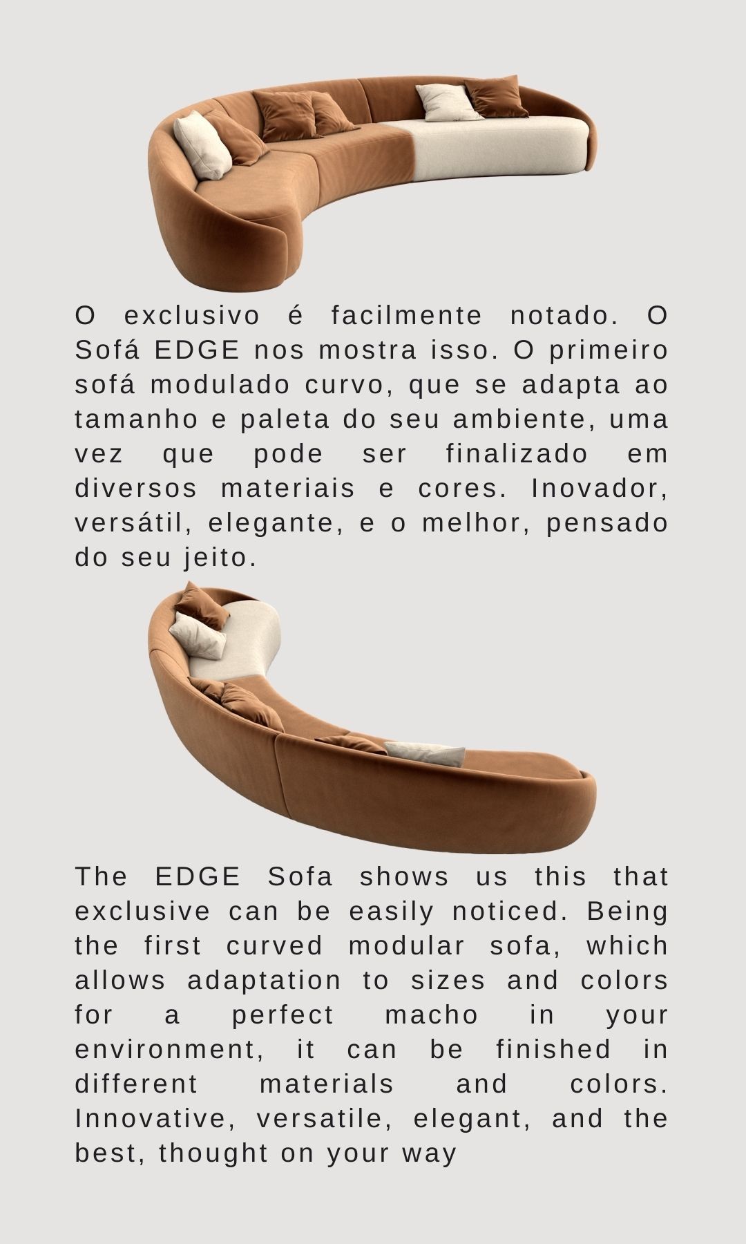 O exclusivo é facilmente notado. O Sofá EDGE nos mostra isso. O primeiro sofá modulado curvo, que se adapta ao tamanho e paleta do seu ambiente, uma vez que pode ser finalizado em diversos materiais e cores. Inovador, versátil, elegante, e o melhor, pensado do seu jeito.