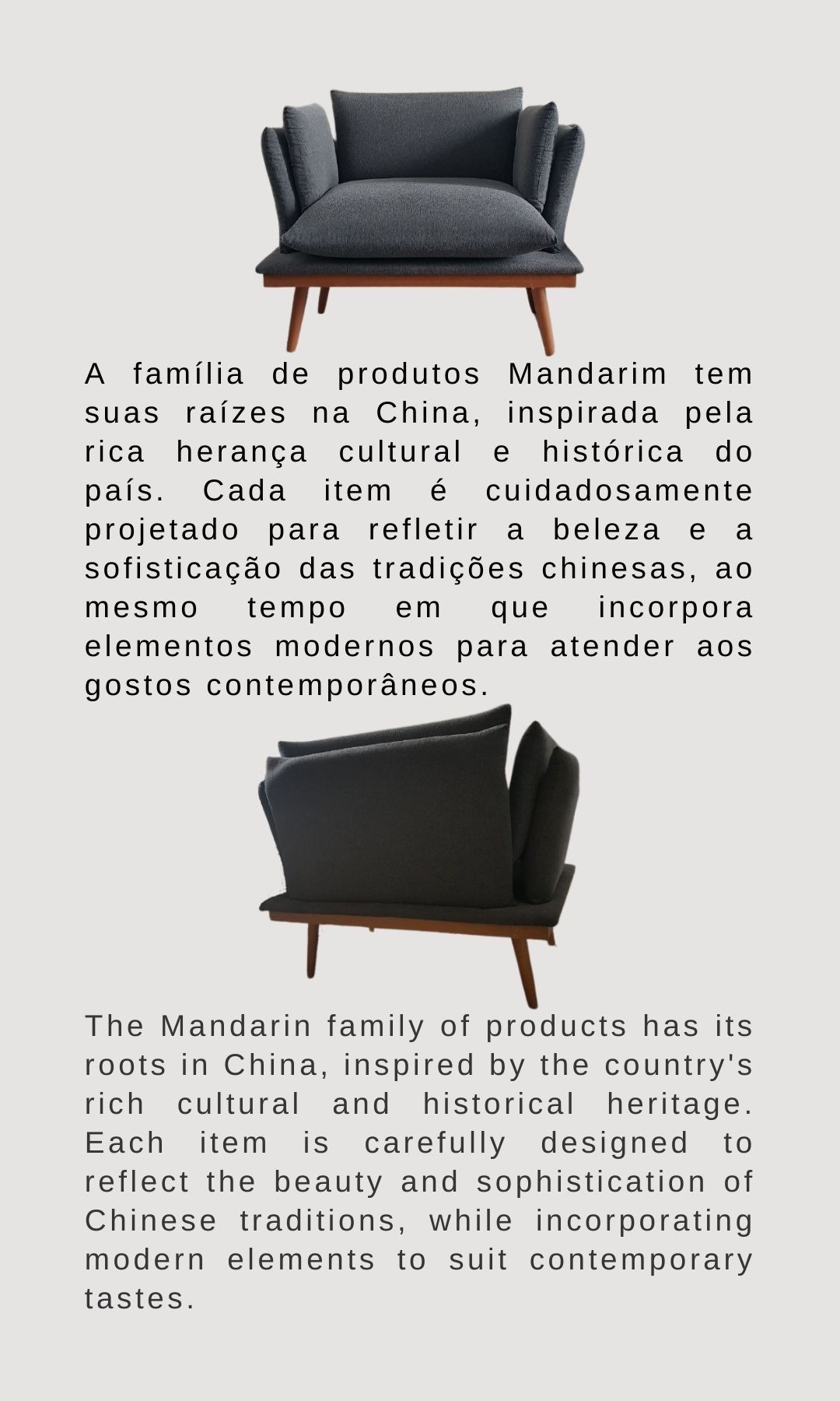 A família de produtos Mandarim tem suas raízes na China, inspirada pela rica herança cultural e histórica do país. Cada item é cuidadosamente projetado para refletir a beleza e a sofisticação das tradições chinesas, ao mesmo tempo em que incorpora elementos modernos para atender aos gostos contemporâneos. The Mandarin family of products has its roots in China, inspired by the country's rich cultural and historical heritage. Each item is carefully designed to reflect the beauty and sophistication of Chinese traditions, while incorporating modern elements to suit contemporary tastes.