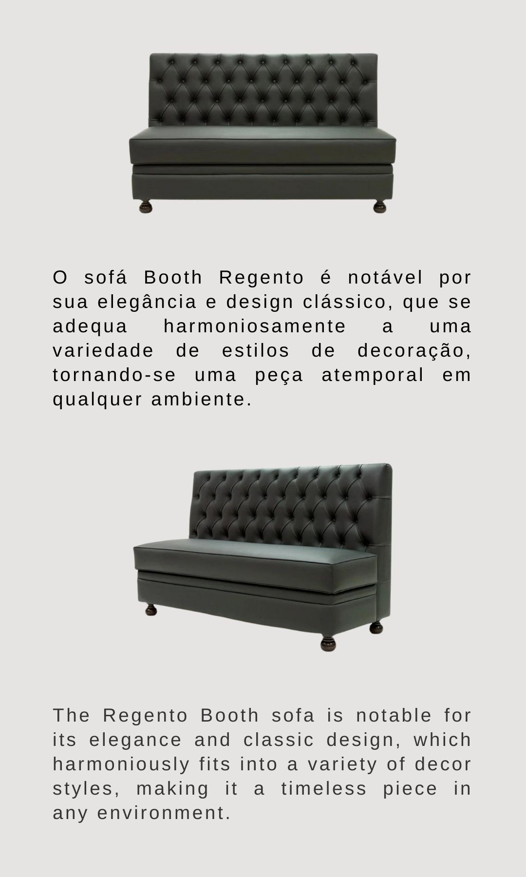 O sofá Booth Regento é notável por sua elegância e design clássico, que se adequa harmoniosamente a uma variedade de estilos de decoração, tornando-se uma peça atemporal em qualquer ambiente.