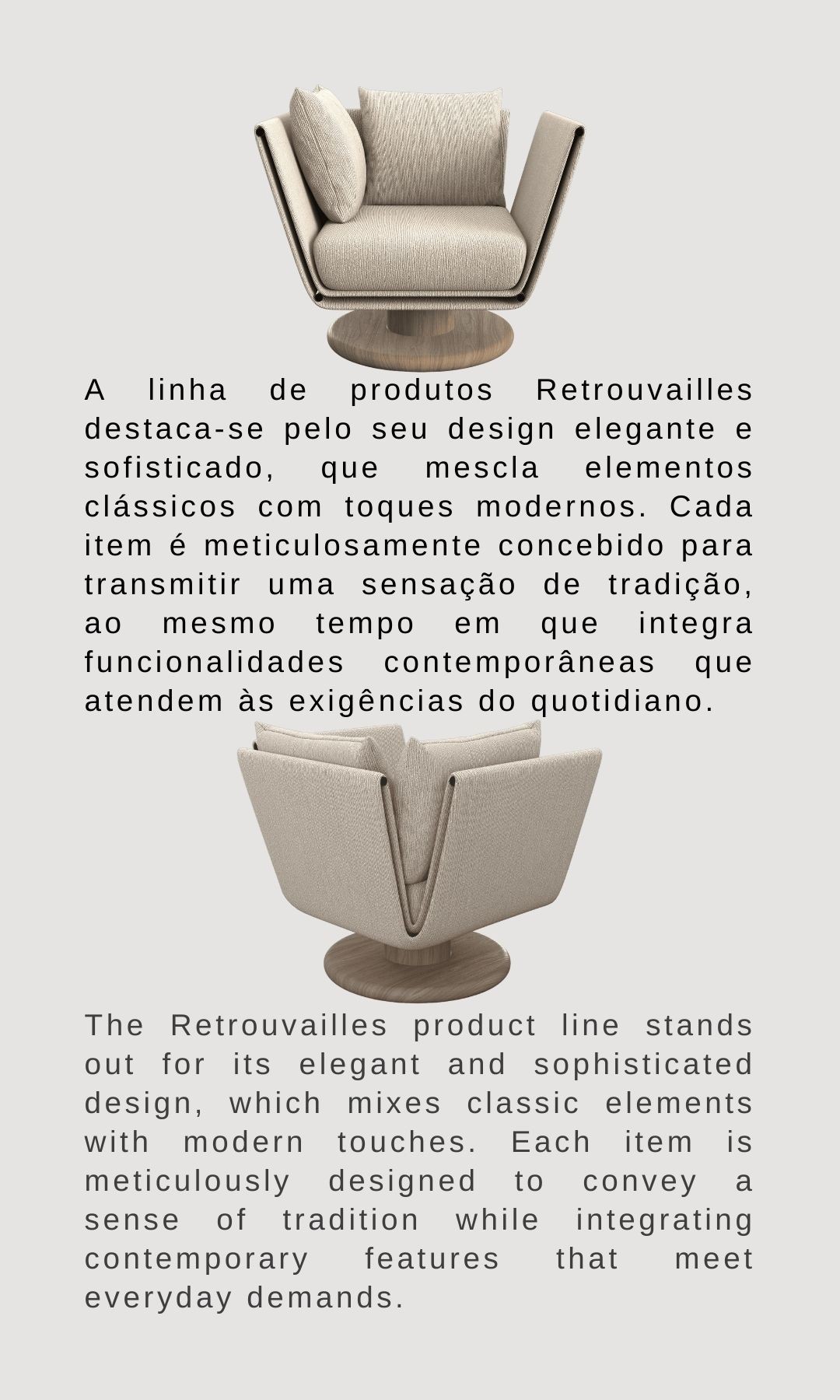A linha de produtos Retrouvailles destaca-se pelo seu design elegante e sofisticado, que mescla elementos clássicos com toques modernos. Cada item é meticulosamente concebido para transmitir uma sensação de tradição, ao mesmo tempo em que integra funcionalidades contemporâneas que atendem às exigências do quotidiano.