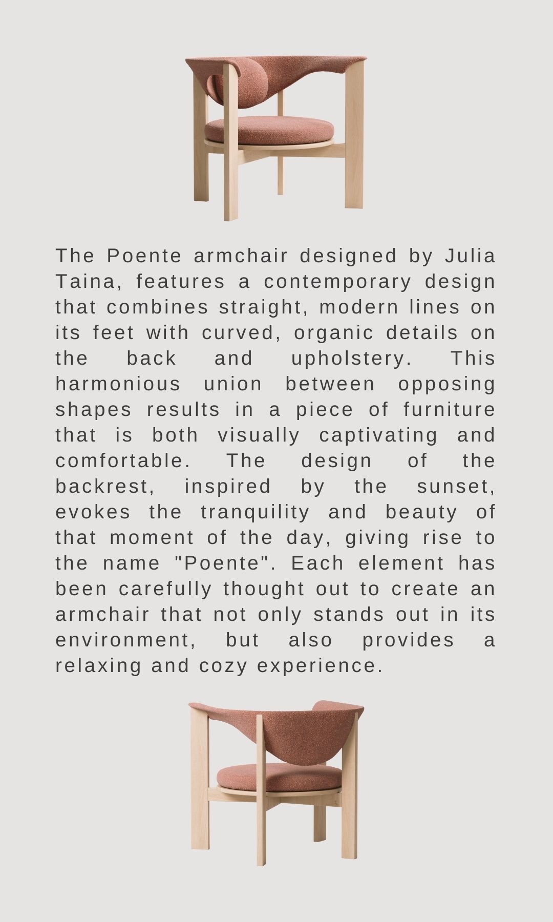 The Poente Armchair features a contemporary design that combines straight, modern lines on its feet with curved, organic details on the back and upholstery. This harmonious union between opposing shapes results in a piece of furniture that is both visually captivating and comfortable. The design of the backrest, inspired by the sunset, evokes the tranquility and beauty of that moment of the day, giving rise to the name "Poente". Each element has been carefully thought out to create an armchair that not only stands out in its environment, but also provides a relaxing and cozy experience.