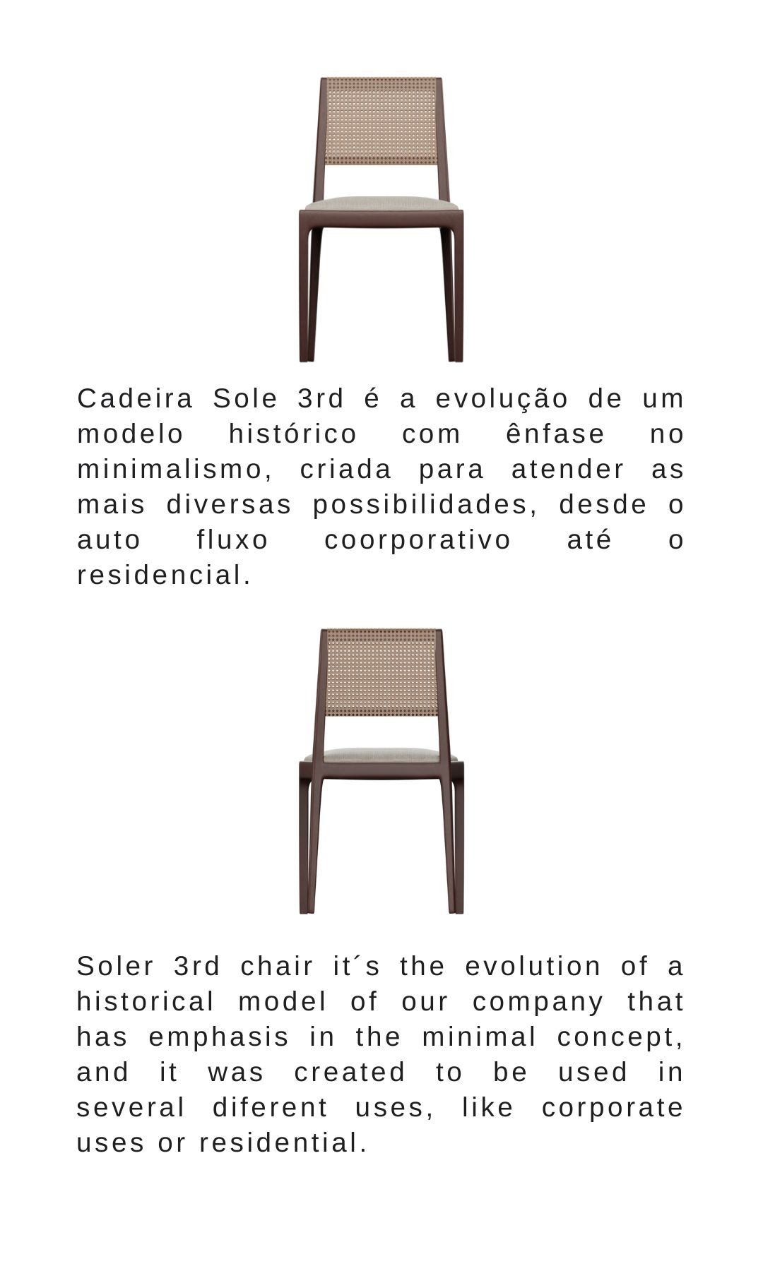 Cadeira Sole 3rd é a evolução de um modelo histórico com ênfase no minimalismo, criada para atender as mais diversas possibilidades, desde o auto fluxo coorporativo até o residencial. Soler 3rd chair it´s the evolution of a historical model of our company that has emphasis in the minimal concept, and it was created to be used in several diferent uses, like corporate uses or residential.