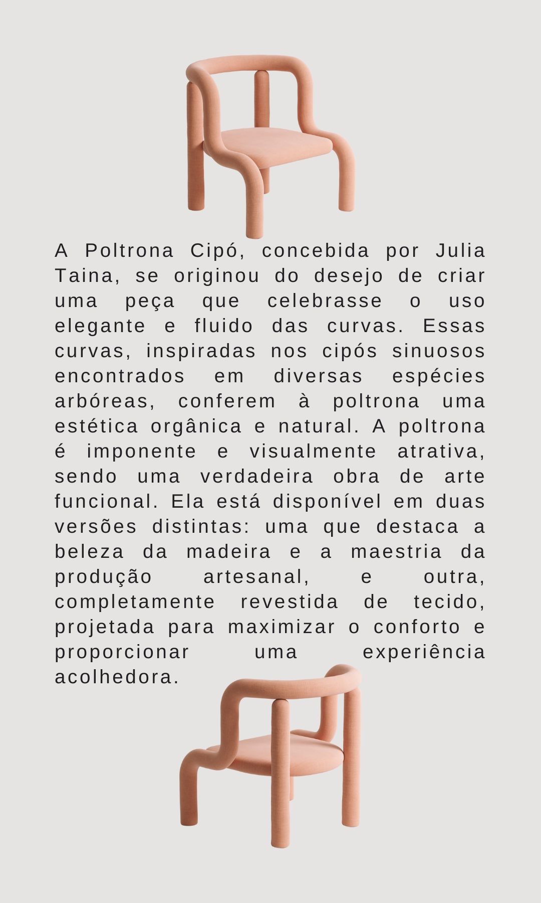 A Poltrona Cipó, concebida por Julia Taina, se originou do desejo de criar uma peça que celebrasse o uso elegante e fluido das curvas. Essas curvas, inspiradas nos cipós sinuosos encontrados em diversas espécies arbóreas, conferem à poltrona uma estética orgânica e natural. A poltrona é imponente e visualmente atrativa, sendo uma verdadeira obra de arte funcional. Ela está disponível em duas versões distintas: uma que destaca a beleza da madeira e a maestria da produção artesanal, e outra, completamente revestida de tecido, projetada para maximizar o conforto e proporcionar uma experiência acolhedora.