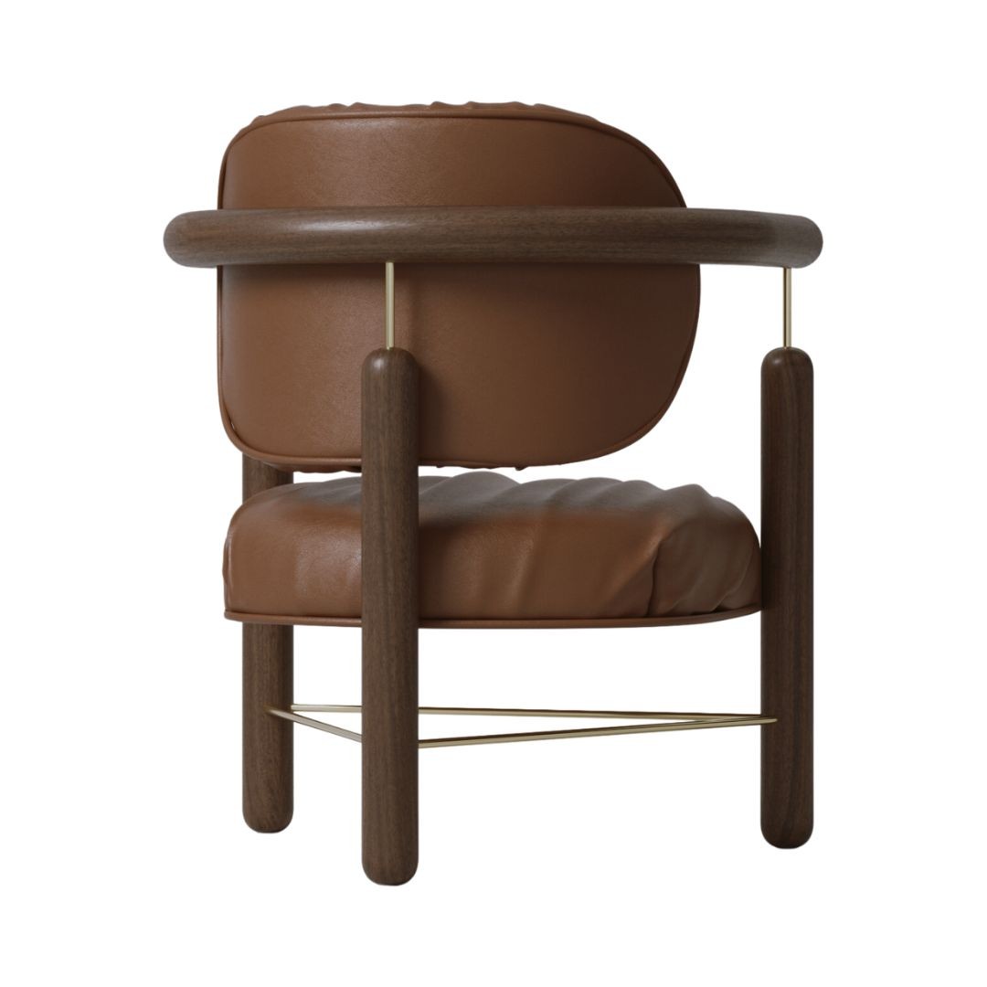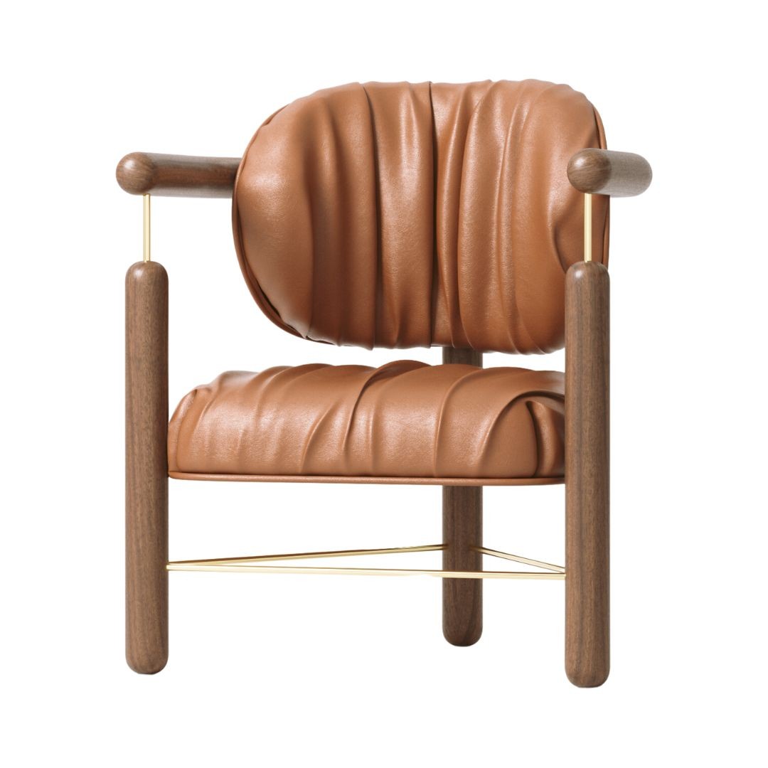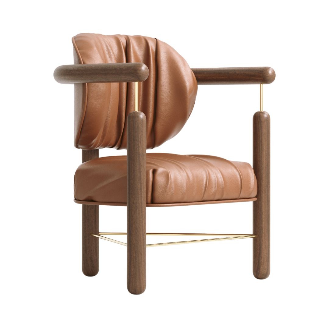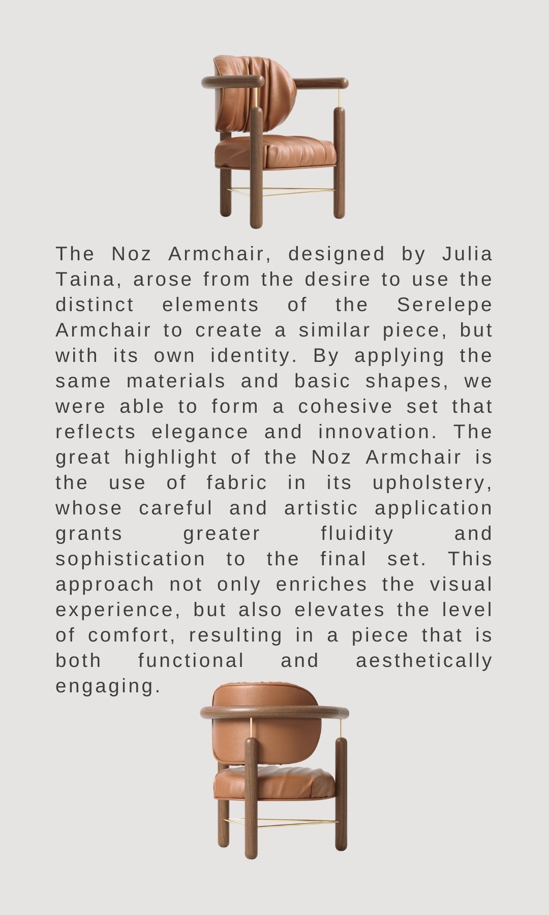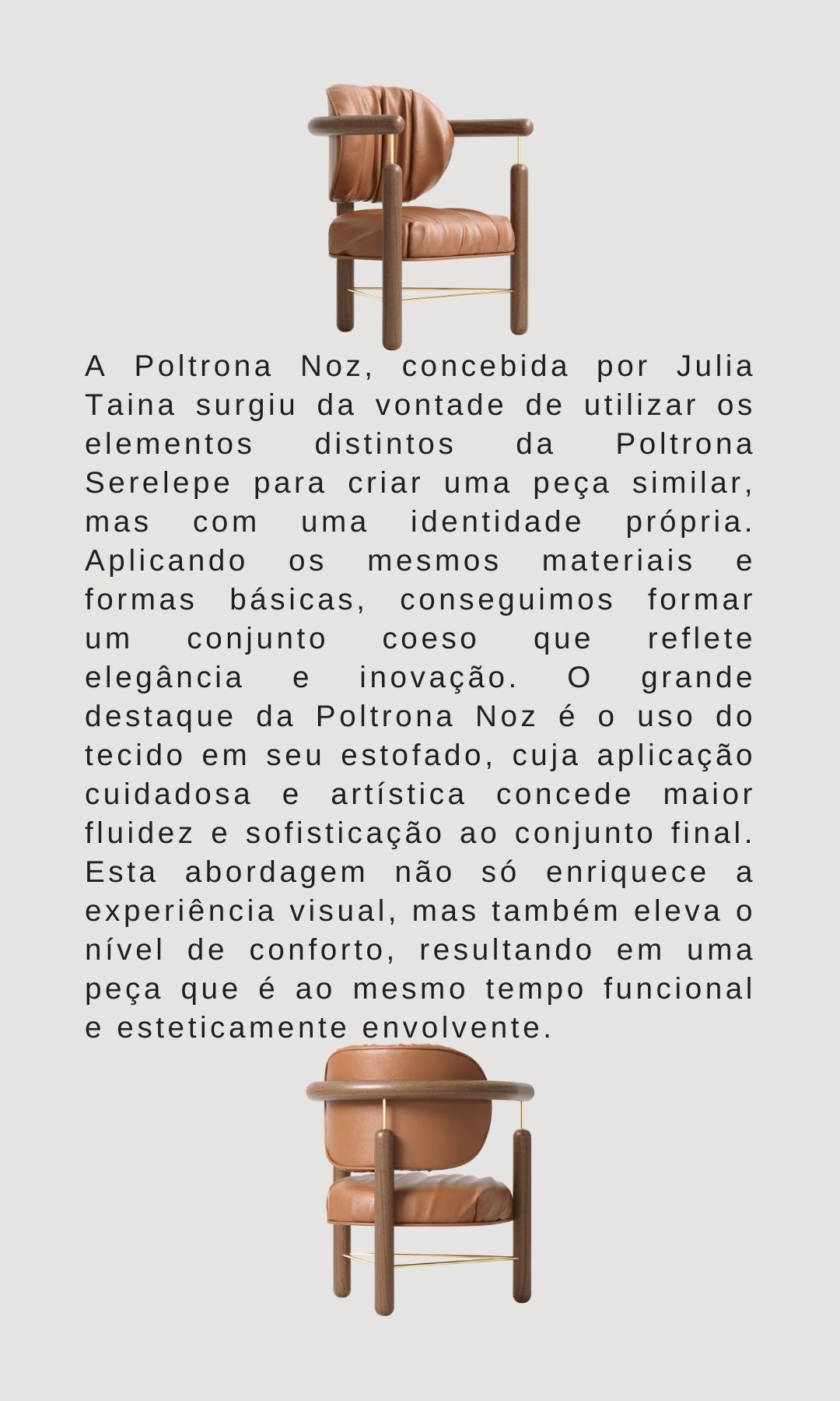 A Poltrona Noz, concebida por Julia Taina surgiu da vontade de utilizar os elementos distintos da Poltrona Serelepe para criar uma peça similar, mas com uma identidade própria. Aplicando os mesmos materiais e formas básicas, conseguimos formar um conjunto coeso que reflete elegância e inovação. O grande destaque da Poltrona Noz é o uso do tecido em seu estofado, cuja aplicação cuidadosa e artística concede maior fluidez e sofisticação ao conjunto final. Esta abordagem não só enriquece a experiência visual, mas também eleva o nível de conforto, resultando em uma peça que é ao mesmo tempo funcional e esteticamente envolvente.