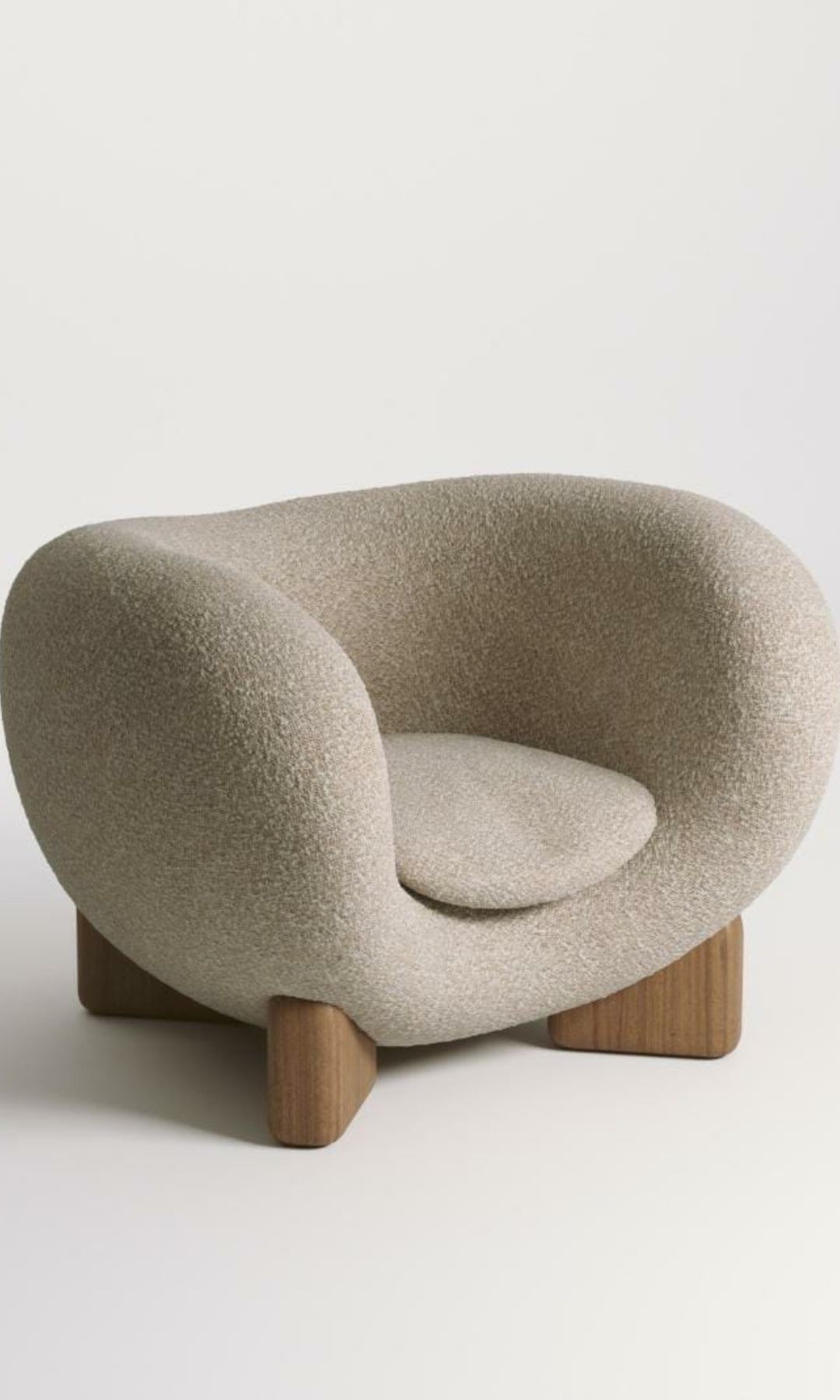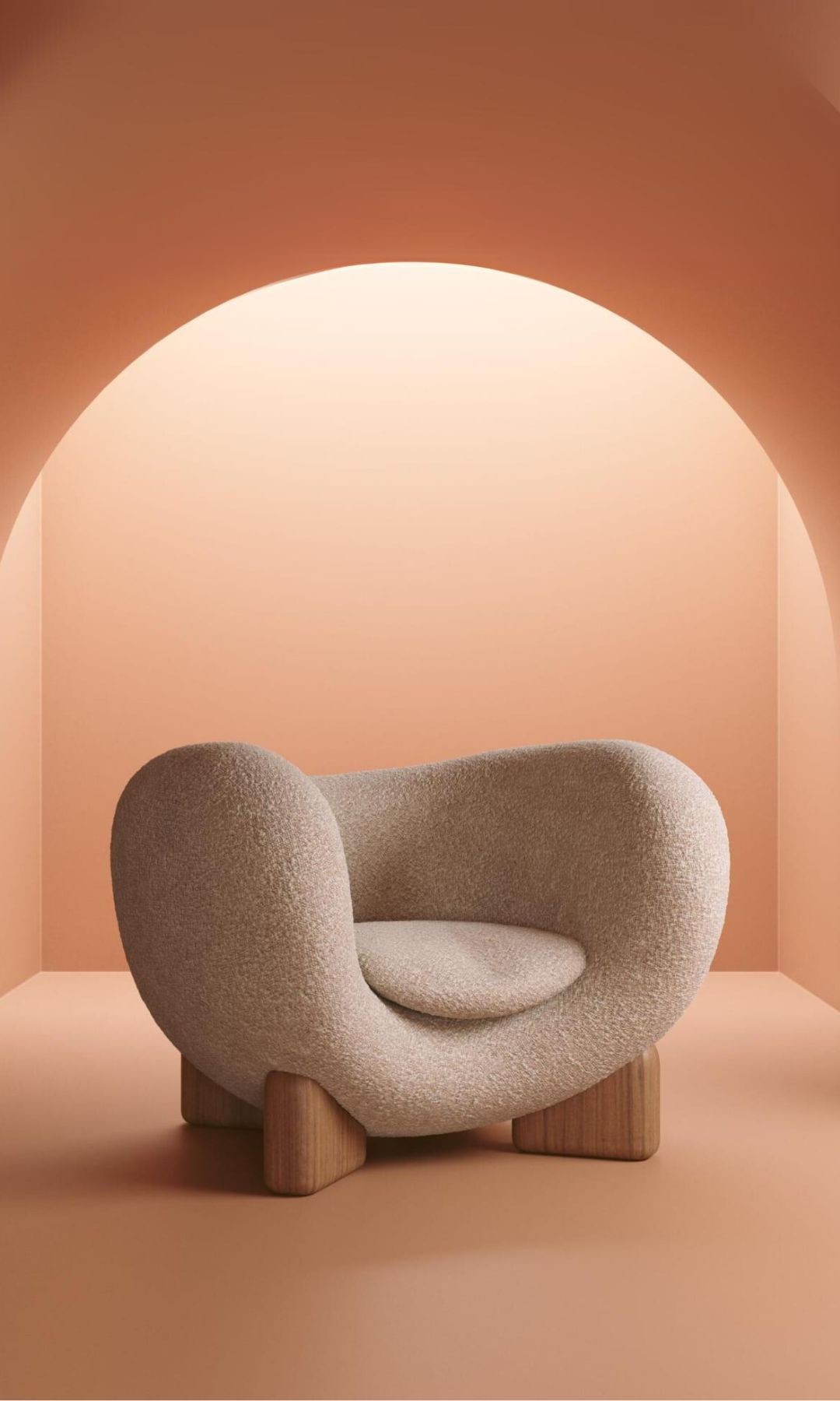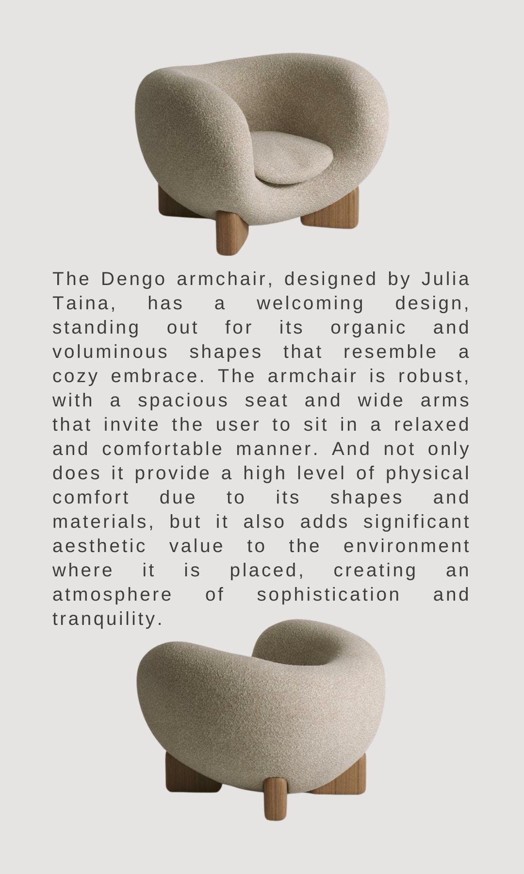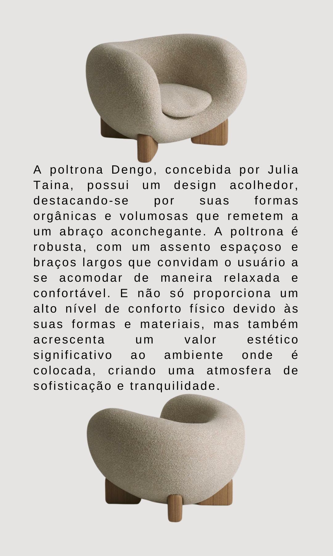 A poltrona Dengo, concebida por Julia Taina, possui um design acolhedor, destacando-se por suas formas orgânicas e volumosas que remetem a um abraço aconchegante. A poltrona é robusta, com um assento espaçoso e braços largos que convidam o usuário a se acomodar de maneira relaxada e confortável. E não só proporciona um alto nível de conforto físico devido às suas formas e materiais, mas também acrescenta um valor estético significativo ao ambiente onde é colocada, criando uma atmosfera de sofisticação e tranquilidade.