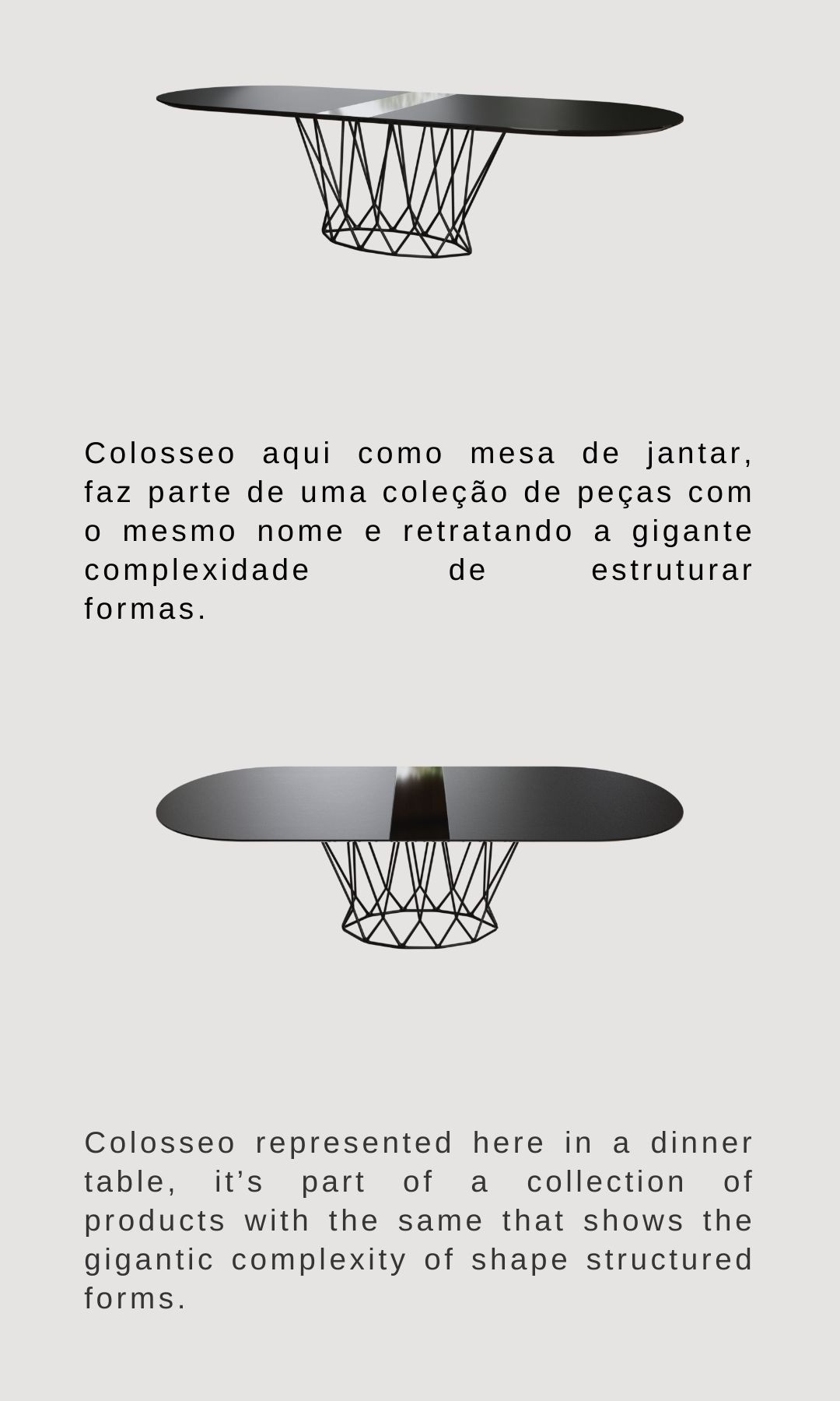 Colosseo aqui como mesa de jantar, faz parte de uma coleção de peças com o mesmo nome e retratando a gigante complexidade de estruturar formas. Colosseo represented here in a dinner table, it’s part of a collection of products with the same that shows the gigantic complexity of shape structured forms.