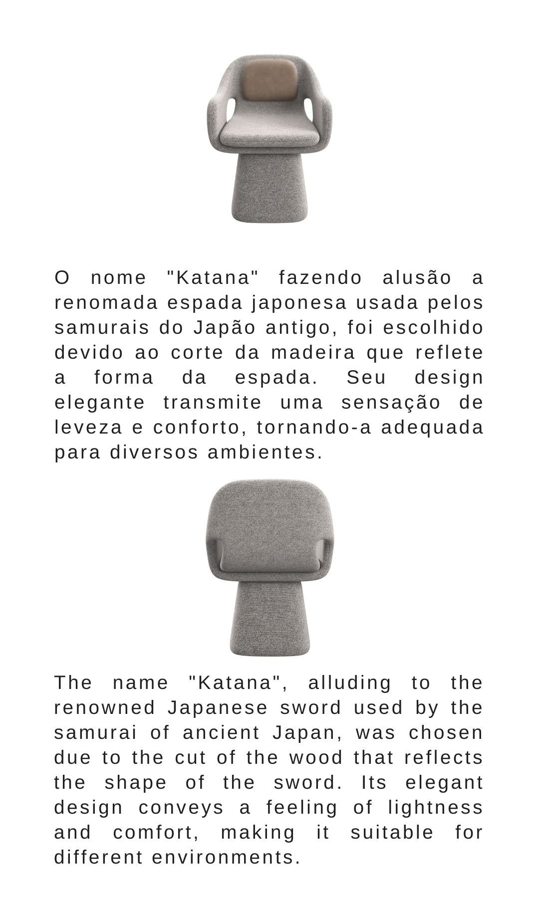 O nome "Katana" fazendo alusão a renomada espada japonesa usada pelos samurais do Japão antigo, foi escolhido devido ao corte da madeira que reflete a forma da espada. Seu design elegante transmite uma sensação de leveza e conforto, tornando-a adequada para diversos ambientes.