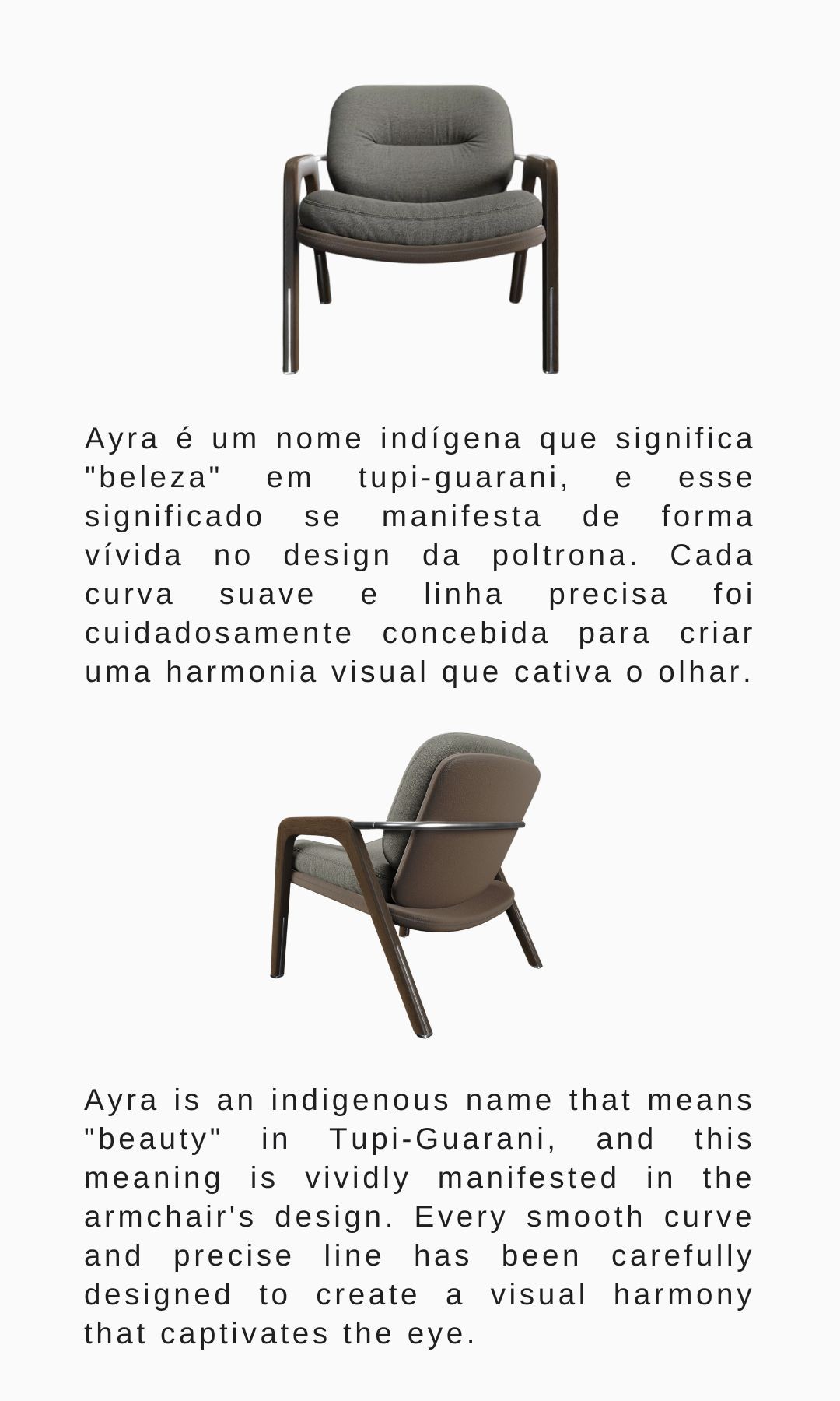 Ayra is an indigenous name that means "beauty" in Tupi-Guarani, and this meaning is vividly manifested in the armchair's design. Every smooth curve and precise line has been carefully designed to create a visual harmony that captivates the eye.