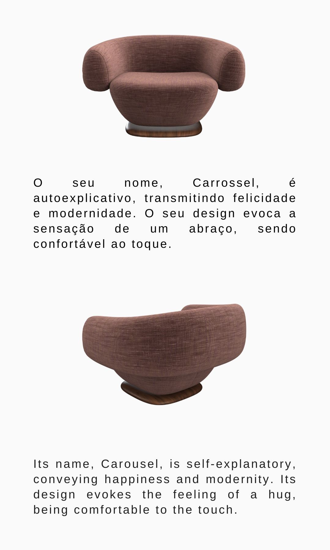 O seu nome, Carrossel, é autoexplicativo, transmitindo felicidade e modernidade. O seu design evoca a sensação de um abraço, sendo confortável ao toque.
