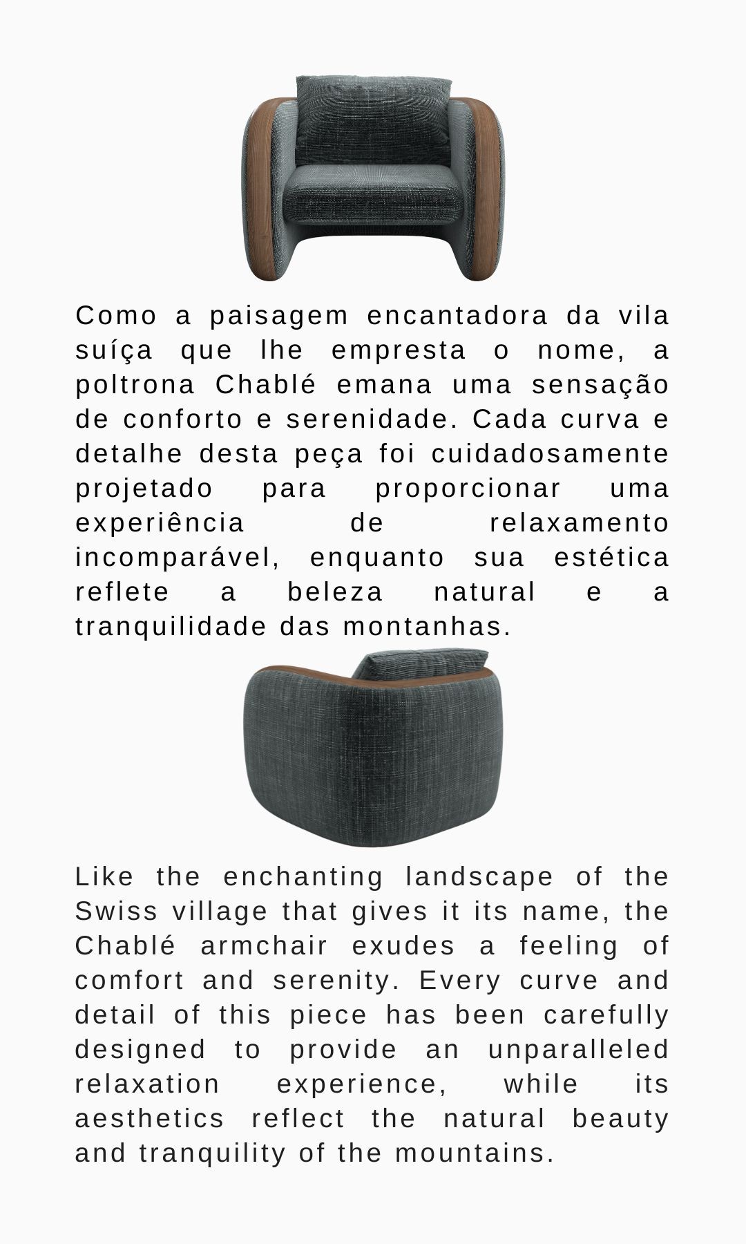 Como a paisagem encantadora da vila suíça que lhe empresta o nome, a poltrona Chablé emana uma sensação de conforto e serenidade. Cada curva e detalhe desta peça foi cuidadosamente projetado para proporcionar uma experiência de relaxamento incomparável, enquanto sua estética reflete a beleza natural e a tranquilidade das montanhas.