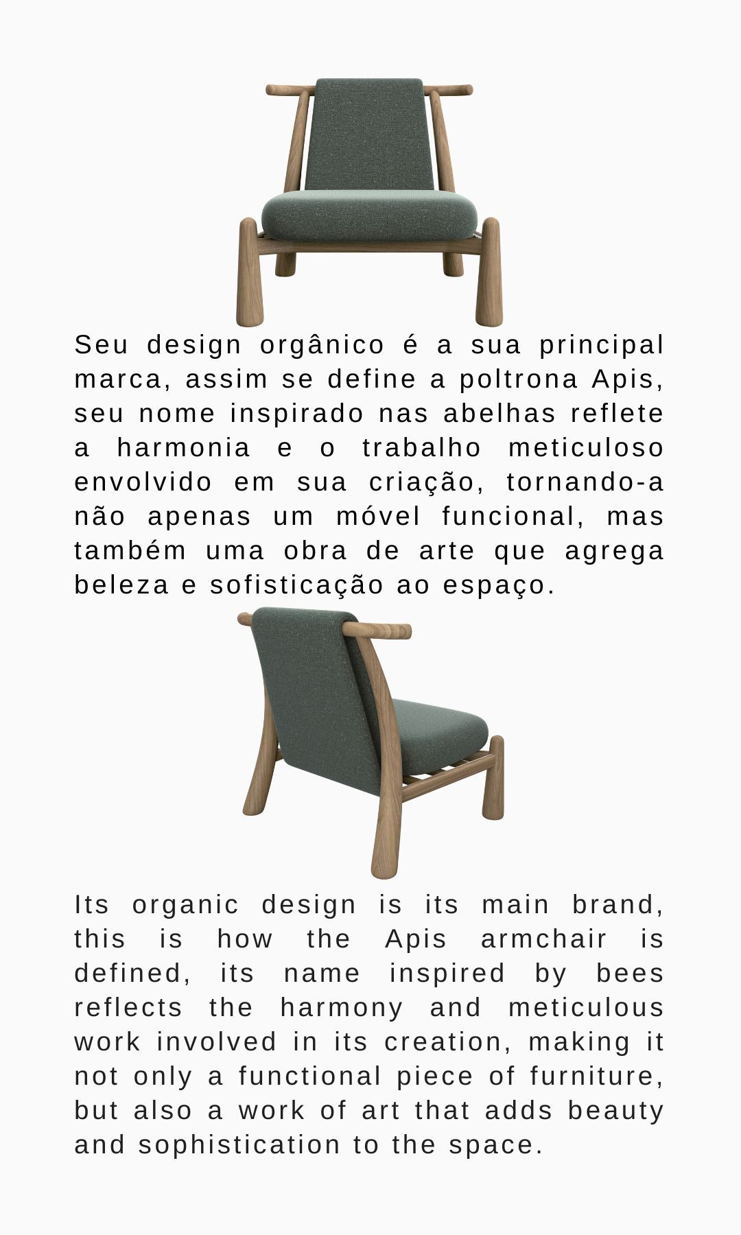 Seu design orgânico é a sua principal marca, assim se define a poltrona Apis, seu nome inspirado nas abelhas reflete a harmonia e o trabalho meticuloso envolvido em sua criação, tornando-a não apenas um móvel funcional, mas também uma obra de arte que agrega beleza e sofisticação ao espaço.
