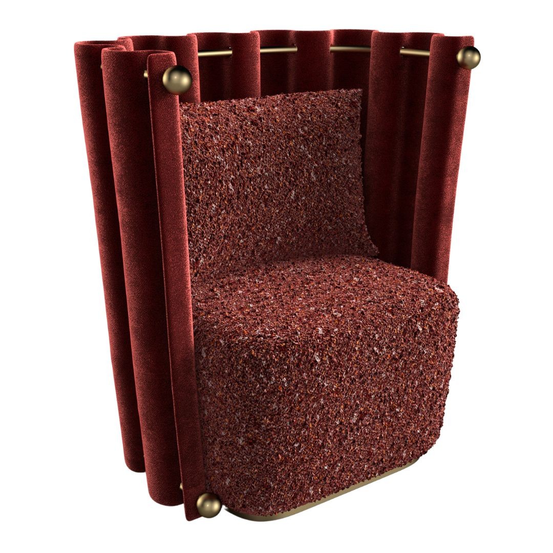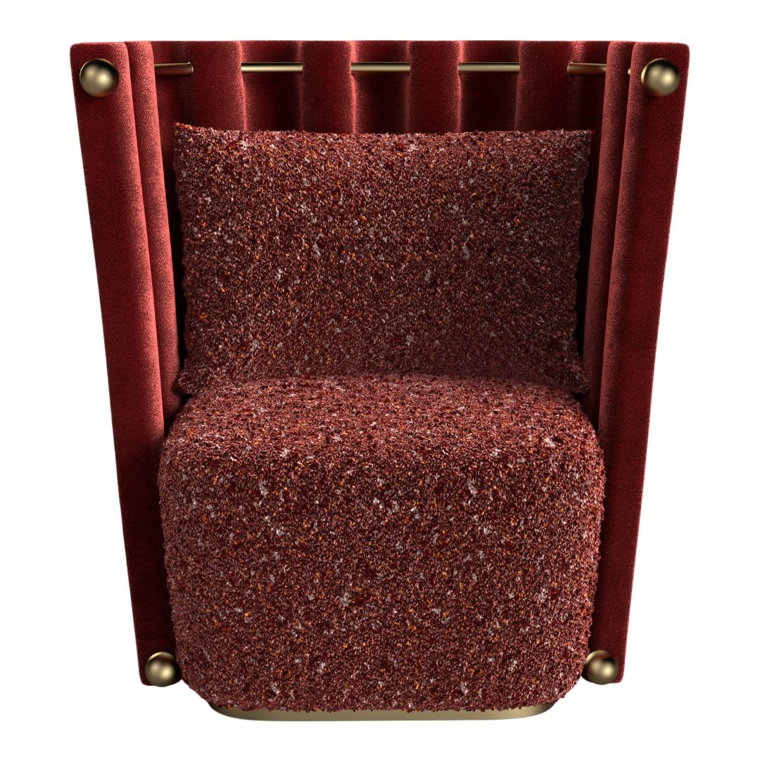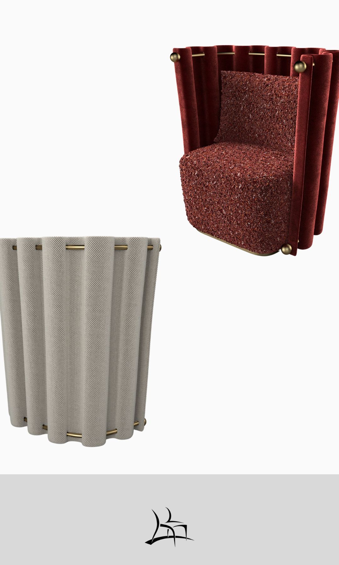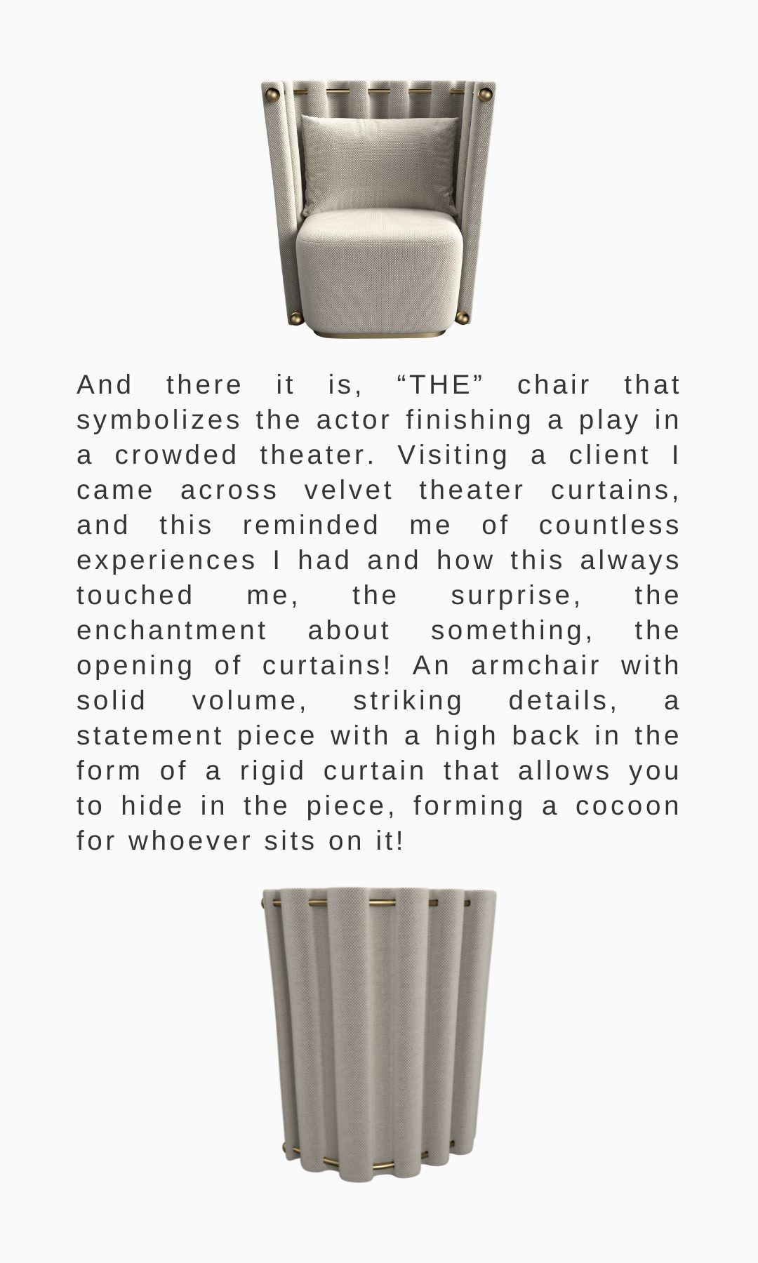 And there it is, “THE” chair that symbolizes the actor finishing a play in a crowded theater. Visiting a client I came across velvet theater curtains, and this reminded me of countless experiences I had and how this always touched me, the surprise, the enchantment about something, the opening of curtains! An armchair with solid volume, striking details, a statement piece with a high back in the form of a rigid curtain that allows you to hide in the piece, forming a cocoon for whoever sits on it!