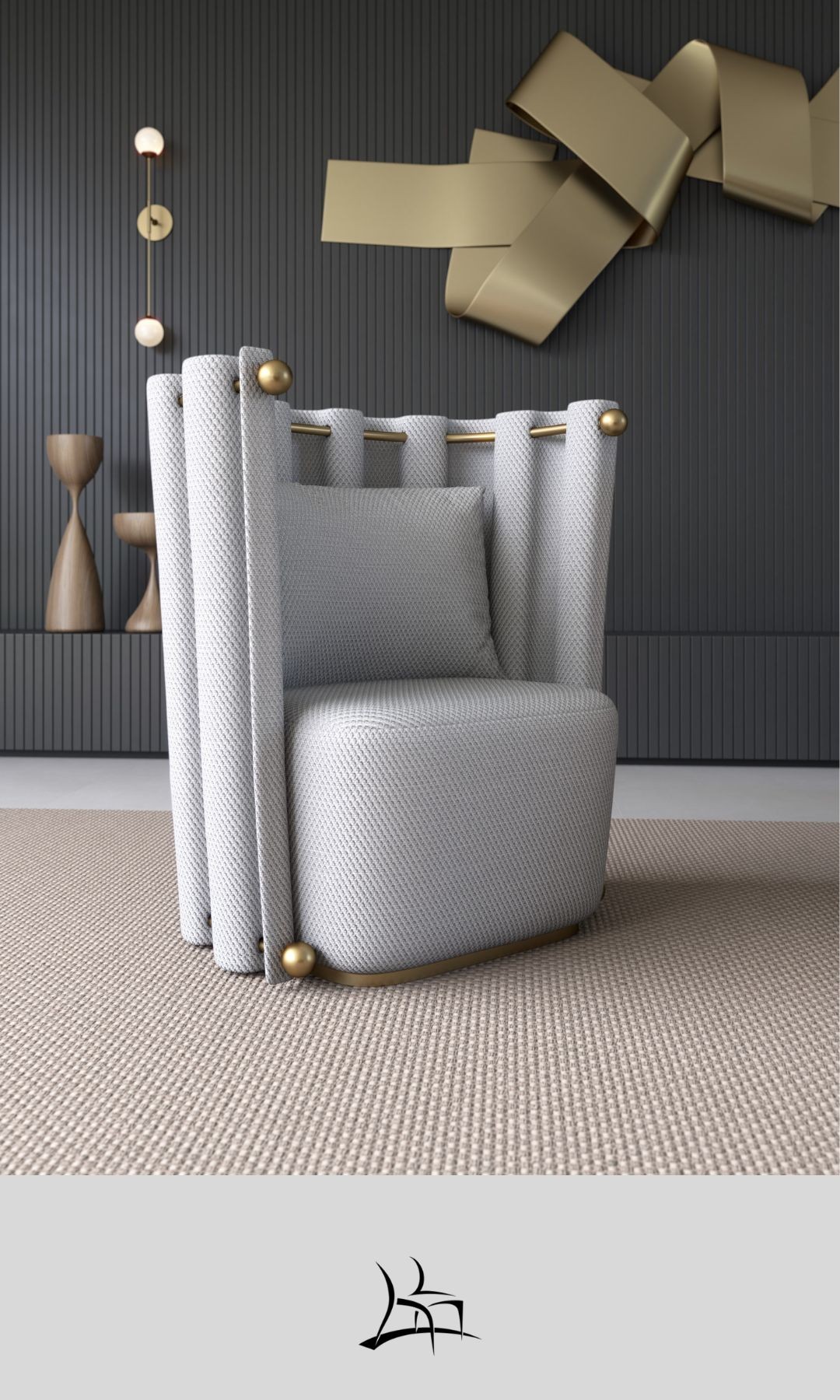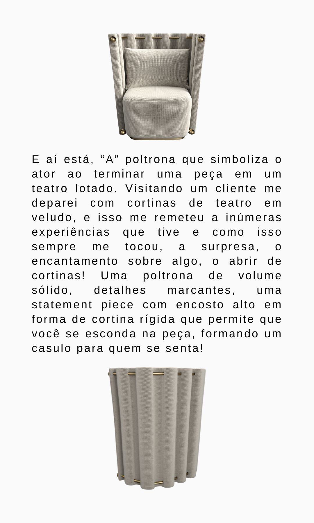 E aí está, “A” poltrona que simboliza o ator ao terminar uma peça em um teatro lotado. Visitando um cliente me deparei com cortinas de teatro em veludo, e isso me remeteu a inúmeras experiências que tive e como isso sempre me tocou, a surpresa, o encantamento sobre algo, o abrir de cortinas! Uma poltrona de volume sólido, detalhes marcantes, uma statement piece com encosto alto em forma de cortina rígida que permite que você se esconda na peça, formando um casulo para quem se senta!